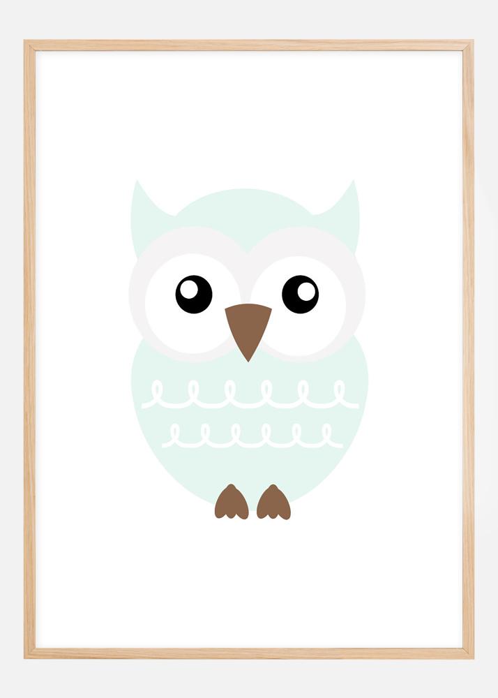 Sweet poster with indoor bird number one, the owl. The illustration of a stylized ice-blue owl against a white background has become a modern classic. The motif fits just as well in the living room as in the children's room and looks extra good with an interior that picks up the colour in the painting. Combine with other birds or animals for a wild feeling.