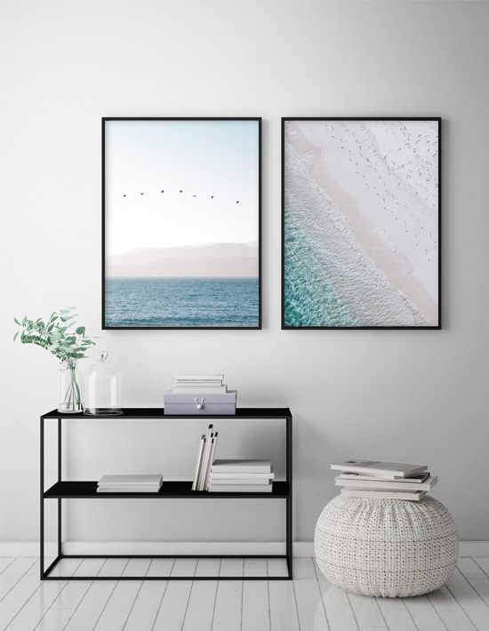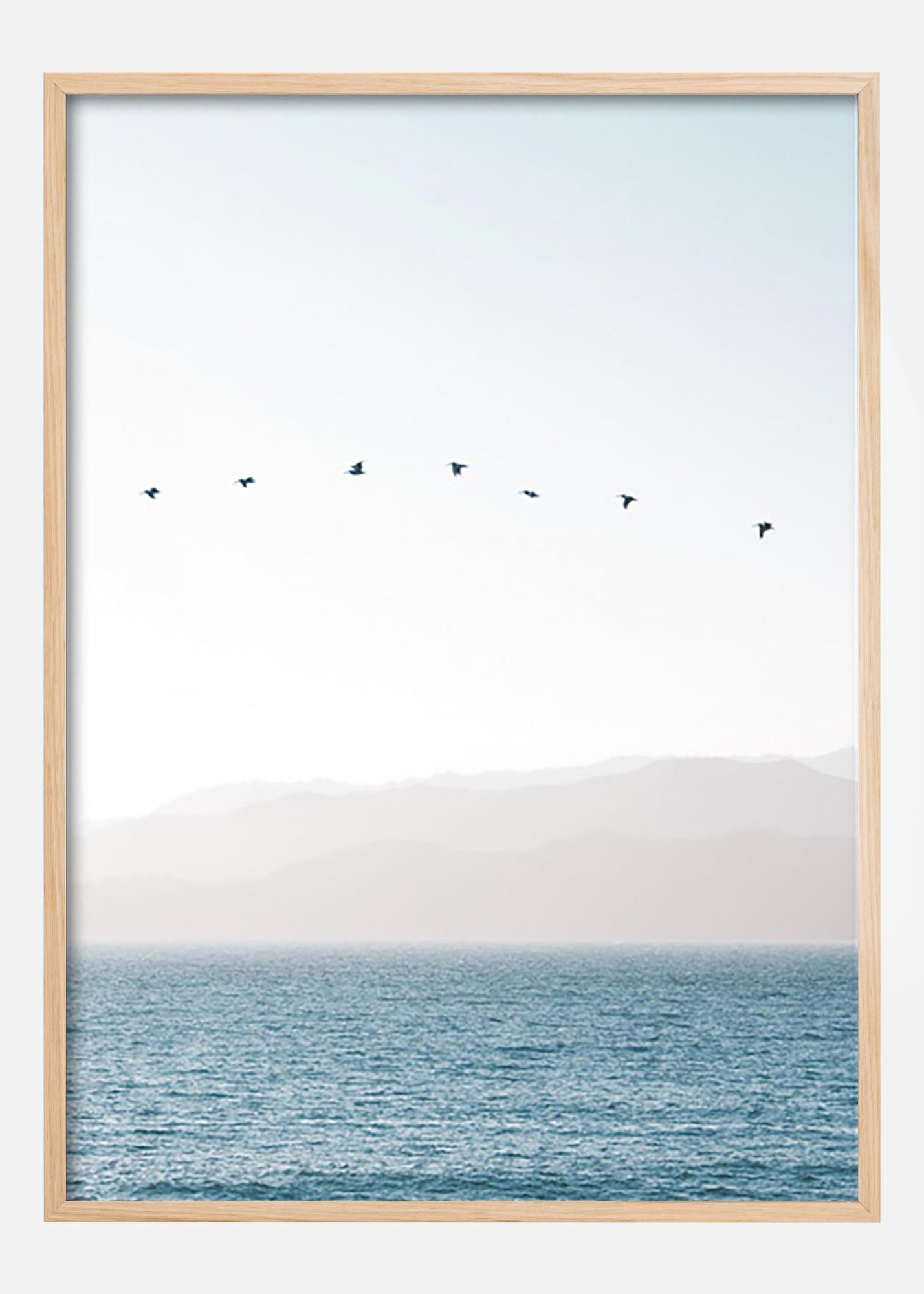 A beautiful nature photograph of birds gliding over blue water against a backdrop of distant mountains and a white sky. A calm and harmonious poster in cooling tones that fits just as well in the bathroom as in the bedroom or living room.