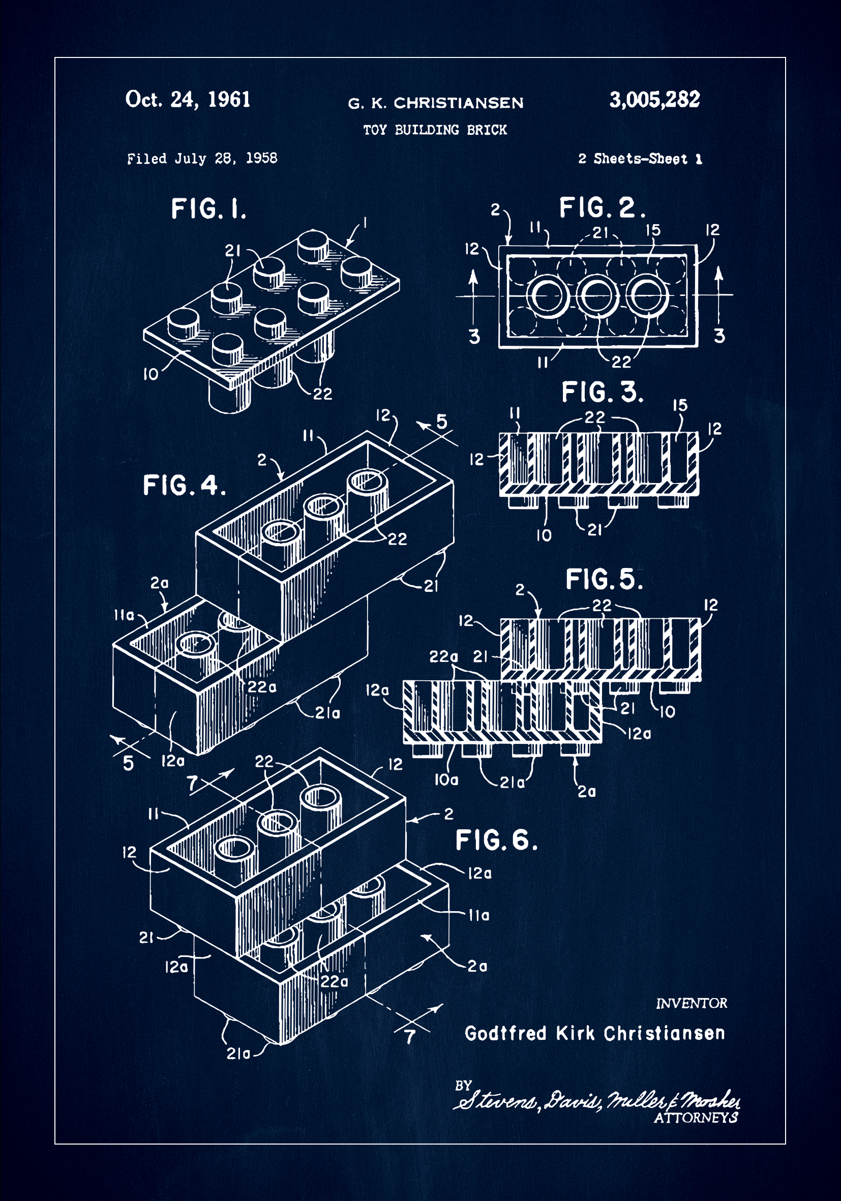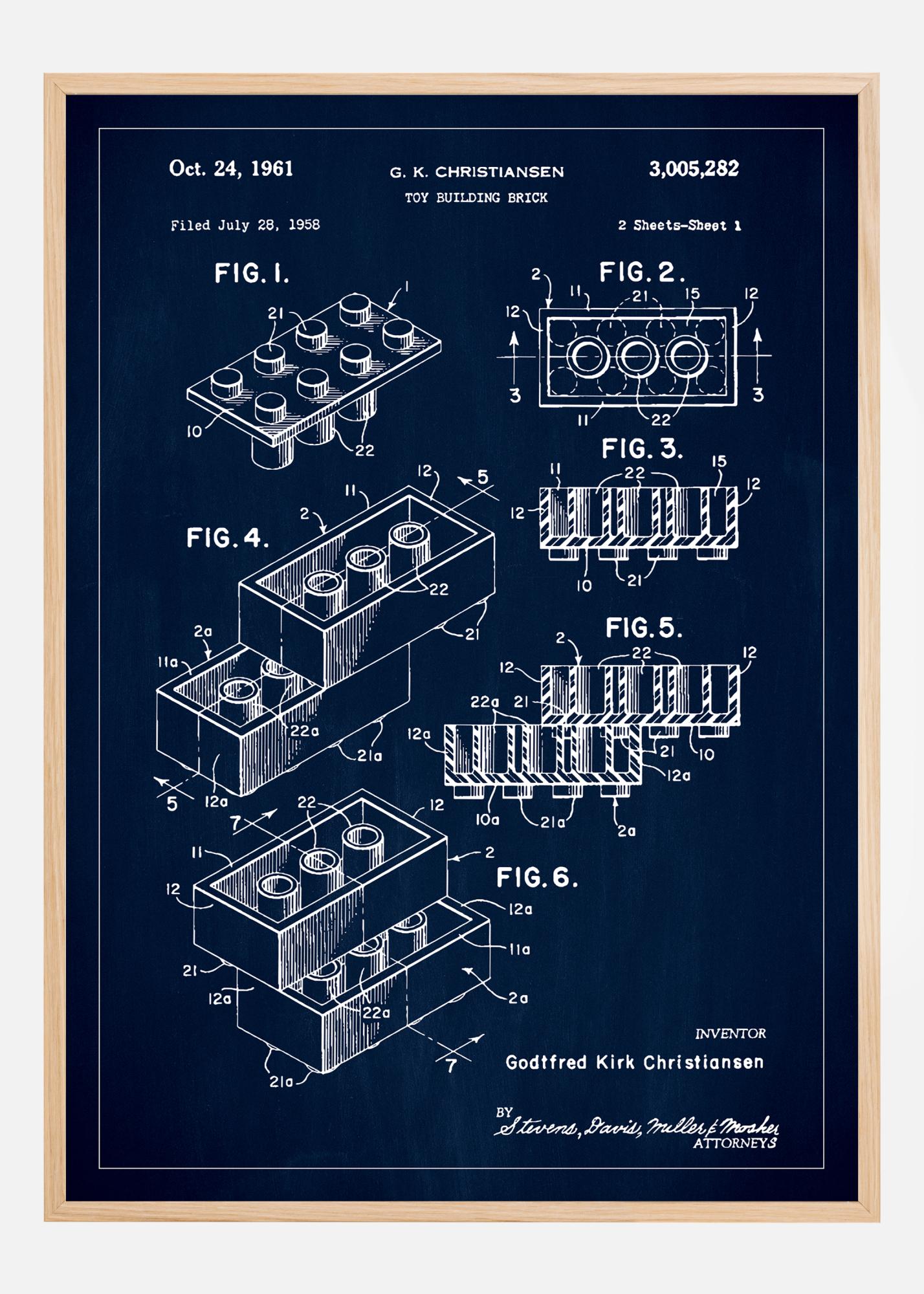 This detailed patent poster depicts the ingenious design of the Lego toy building block that transformed the game of creative play and learning, created by Godtfred Kirk Christiansen. With patent number 3,005,282, granted on October 24, 1961, this illustration captures the essence of an invention that has inspired and delighted generations of builders and thinkers.