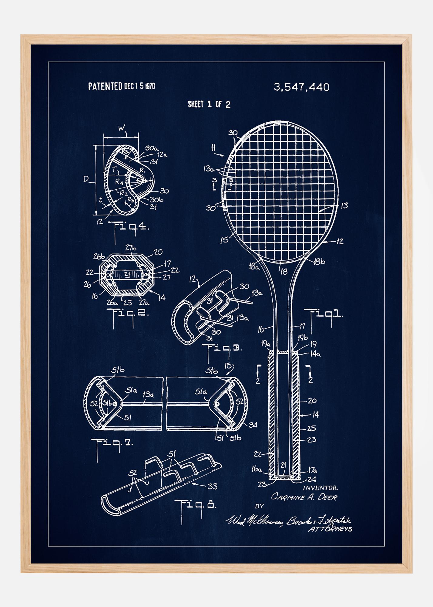 The illustration is not only an elegant decoration but also a source of inspiration and a tribute to the ingenuity within the world of sports. The exact measurements and carefully drawn details evoke admiration for the precision and craftsmanship behind the manufacturing of a tennis racket. This is a perfect patent drawing to hang in a game room, office, or sports bar, to give an authentic and intellectual feel to the room.
