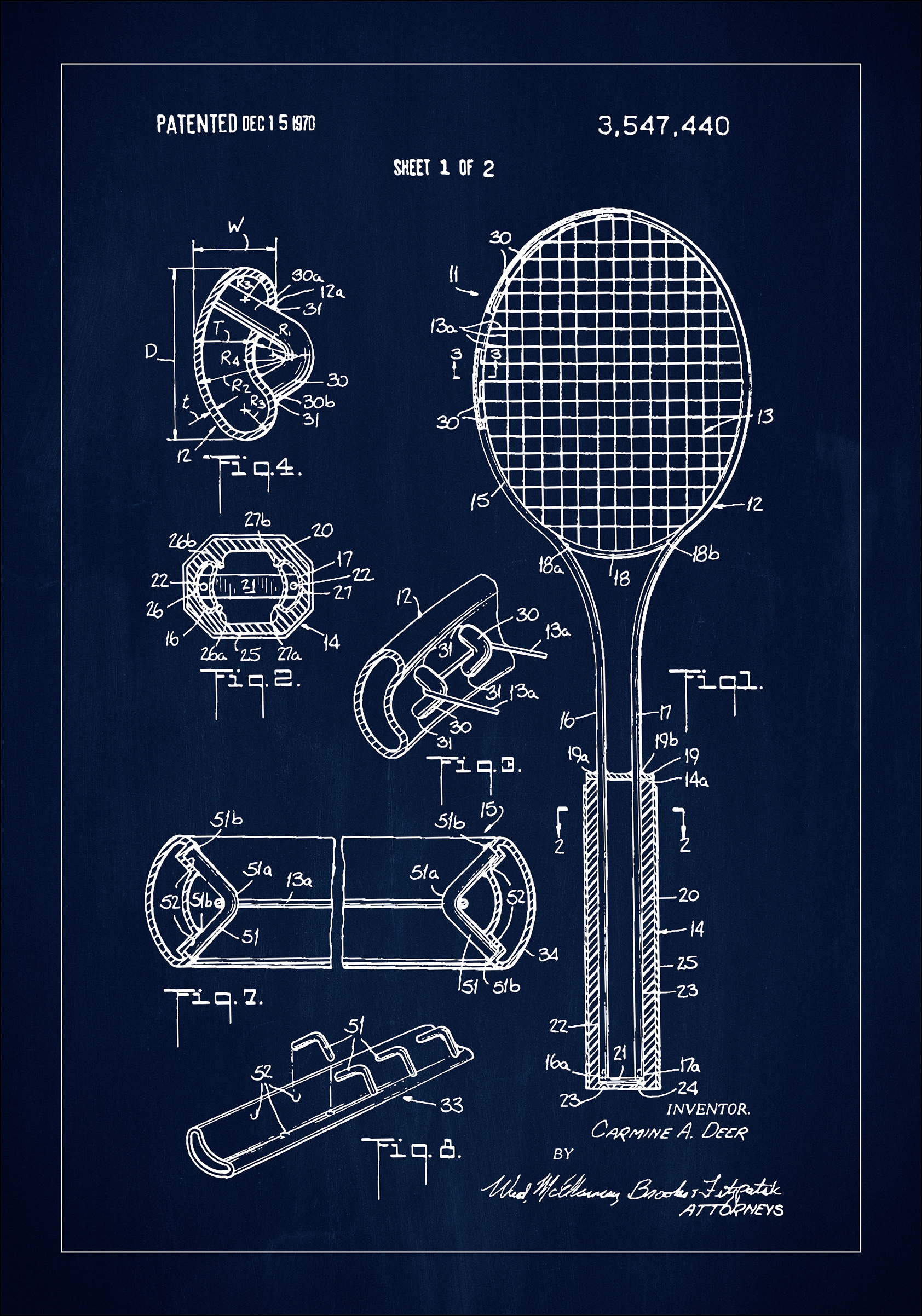 This patent poster reproduces a detailed black and white technical drawing from the United States Patent 3,547,440, issued on December 15, 1970. With its sophisticated and industrial aesthetic, this patent poster showcases the intricate design of a tennis racket and its components, including various cuts and perspectives that highlight the innovation and engineering behind the sports equipment.