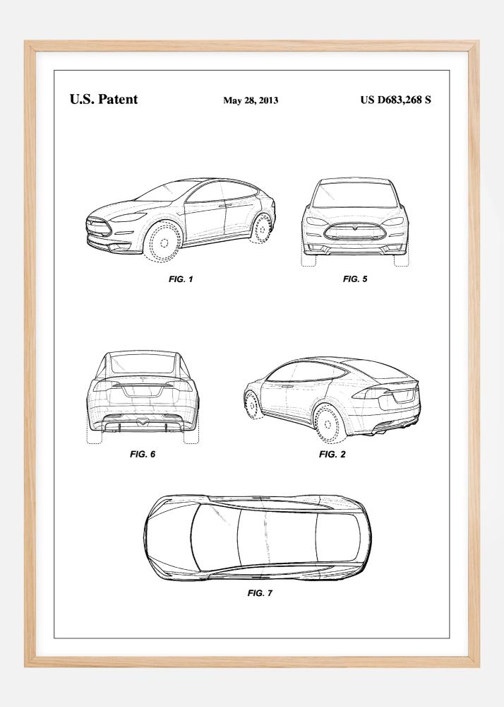Discover a world of innovation and style with this distinctive patent poster of a Tesla, proudly showcasing patent number US D683,268 S, granted on May 28, 2013. This minimalist and sleek patent poster highlights a revolutionary vehicle design that represents the cutting edge of technology and industrial design. The poster captures the eye with its sharp lines and precise details, making it a standout interior piece in any modern home or office.
