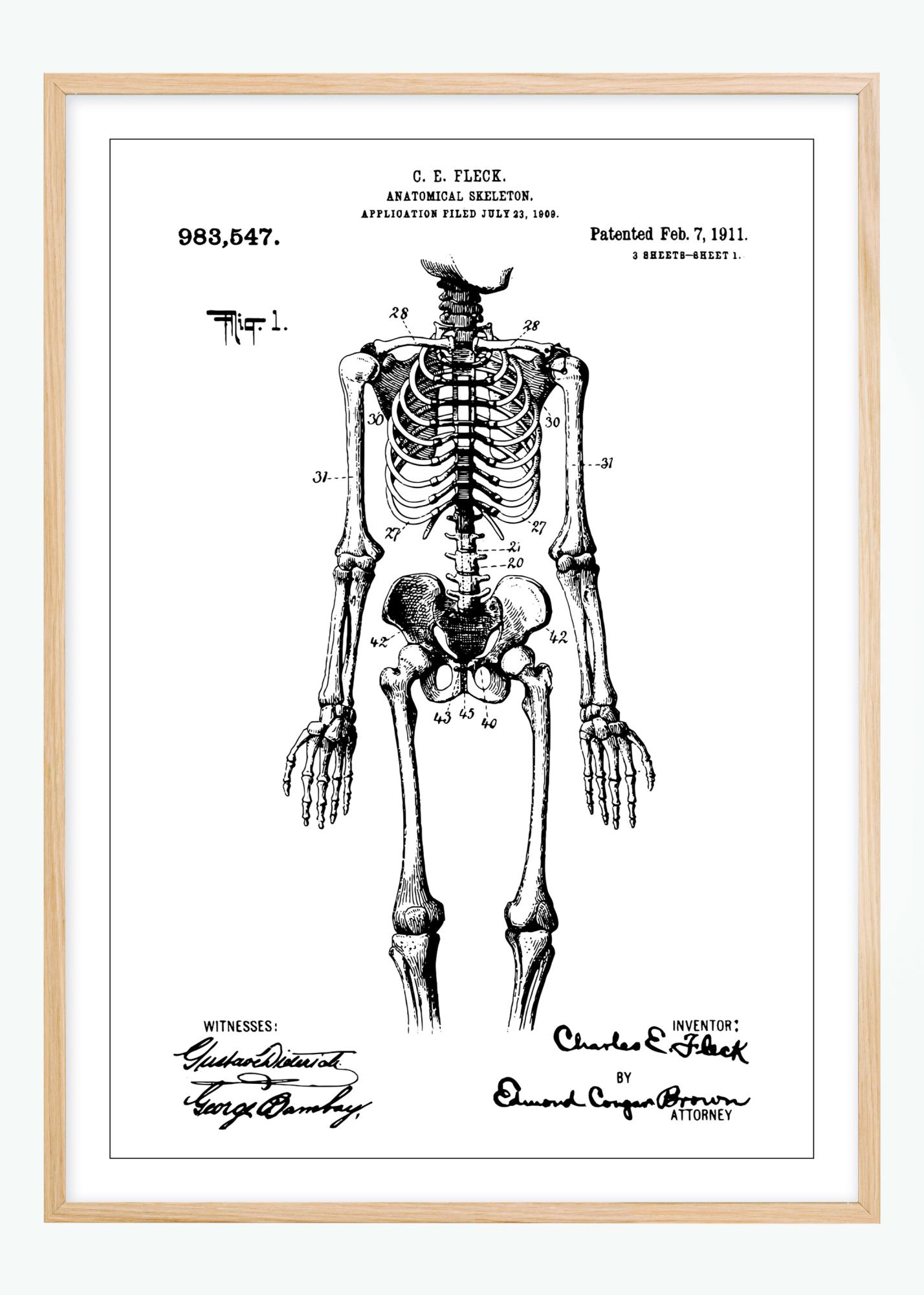 This educational and detailed patent poster presents an anatomical skeleton model, illustrated in patent number 983,547. The patent was granted on February 7, 1911, to C. E. Fleck, and is an interesting example of early medical pedagogy and design. FIG. 1 shows the skeleton in full figure, providing a clear overview of the body's structure and the placement of the bones.