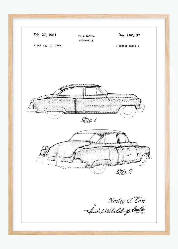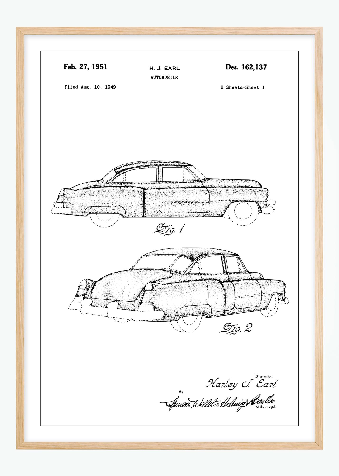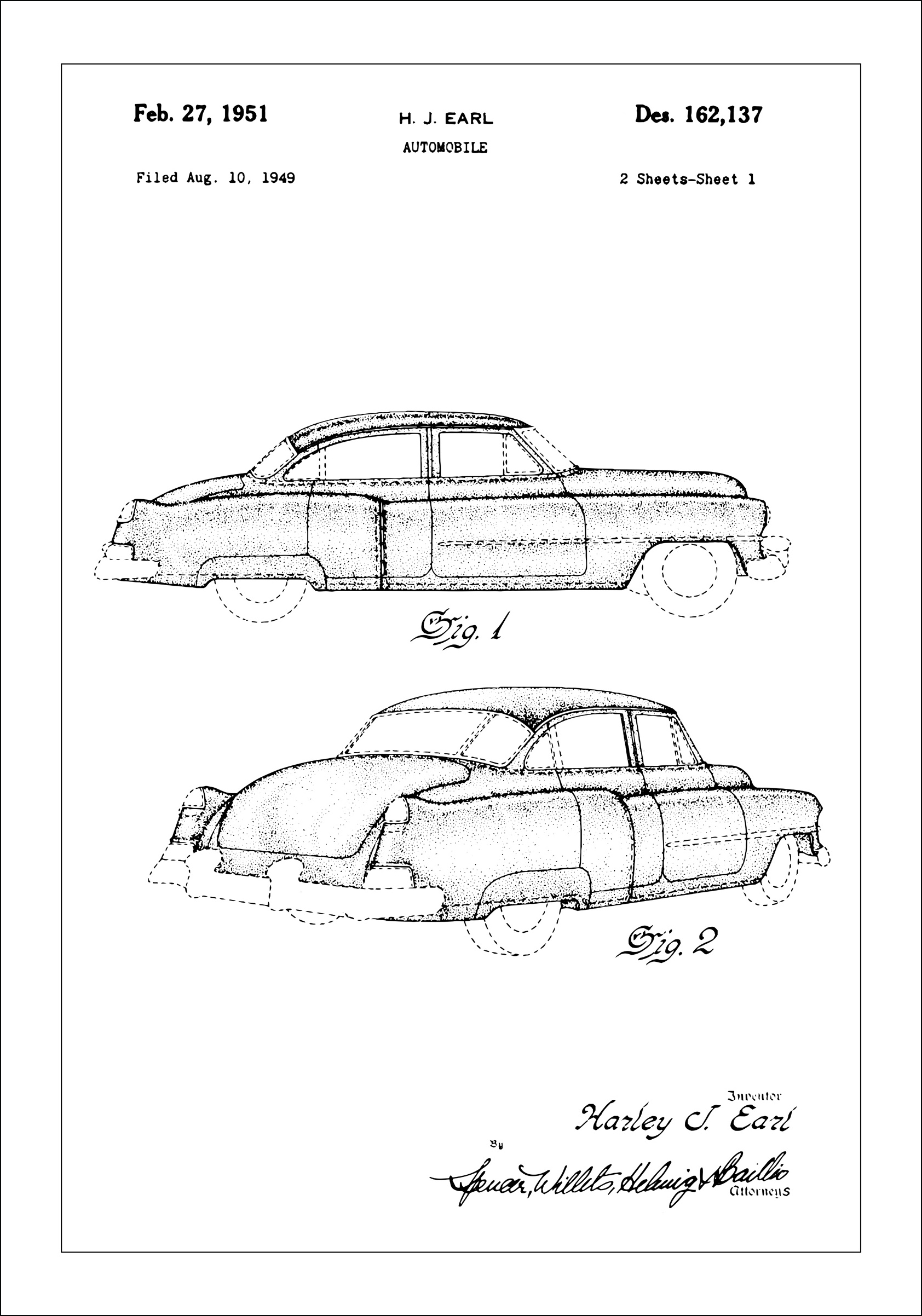This patent poster presents a sophisticated car drawing of a Cadillac, designed by the famous H.J. Earl. Dated February 27, 1951, with patent number Des. 162,137, originally submitted on August 10, 1949, this image captures the essence of the post-war automotive industry. The motif is a tribute to the golden age of the American car and is produced with an attention to detail that appeals to both car manufacturers and design enthusiasts.