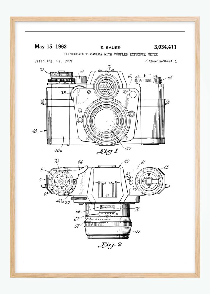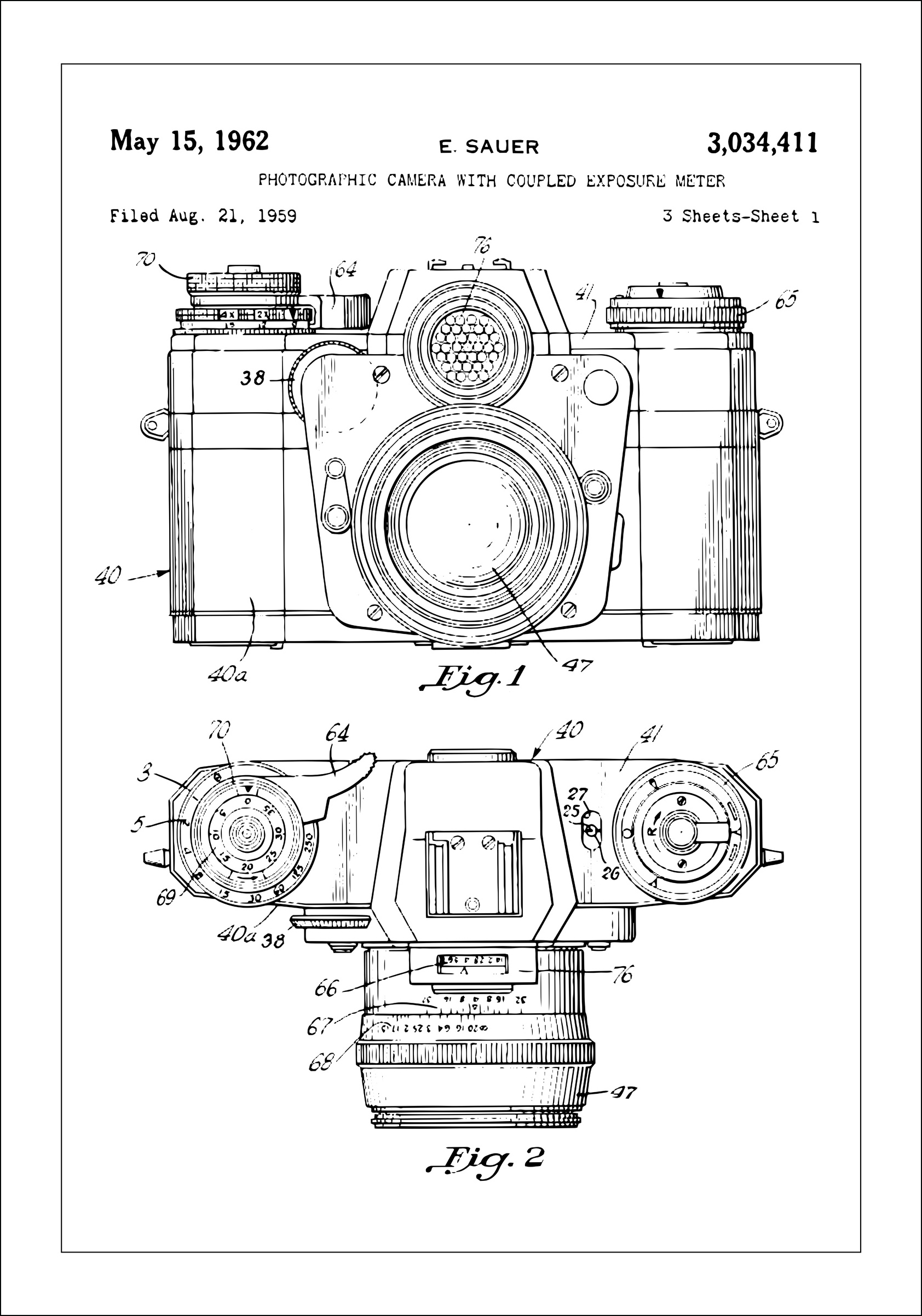 The patent, numbered 3,034,411, was registered on August 21, 1959, and issued on May 15, 1962, to E. Sauer. This patent poster is not only a tribute to the golden age of photography but also a symbol of timeless design and creativity. It's an inventive piece of art that fits into both minimalist and industrial interior styles, a true conversation starter that complements any room where it is placed.