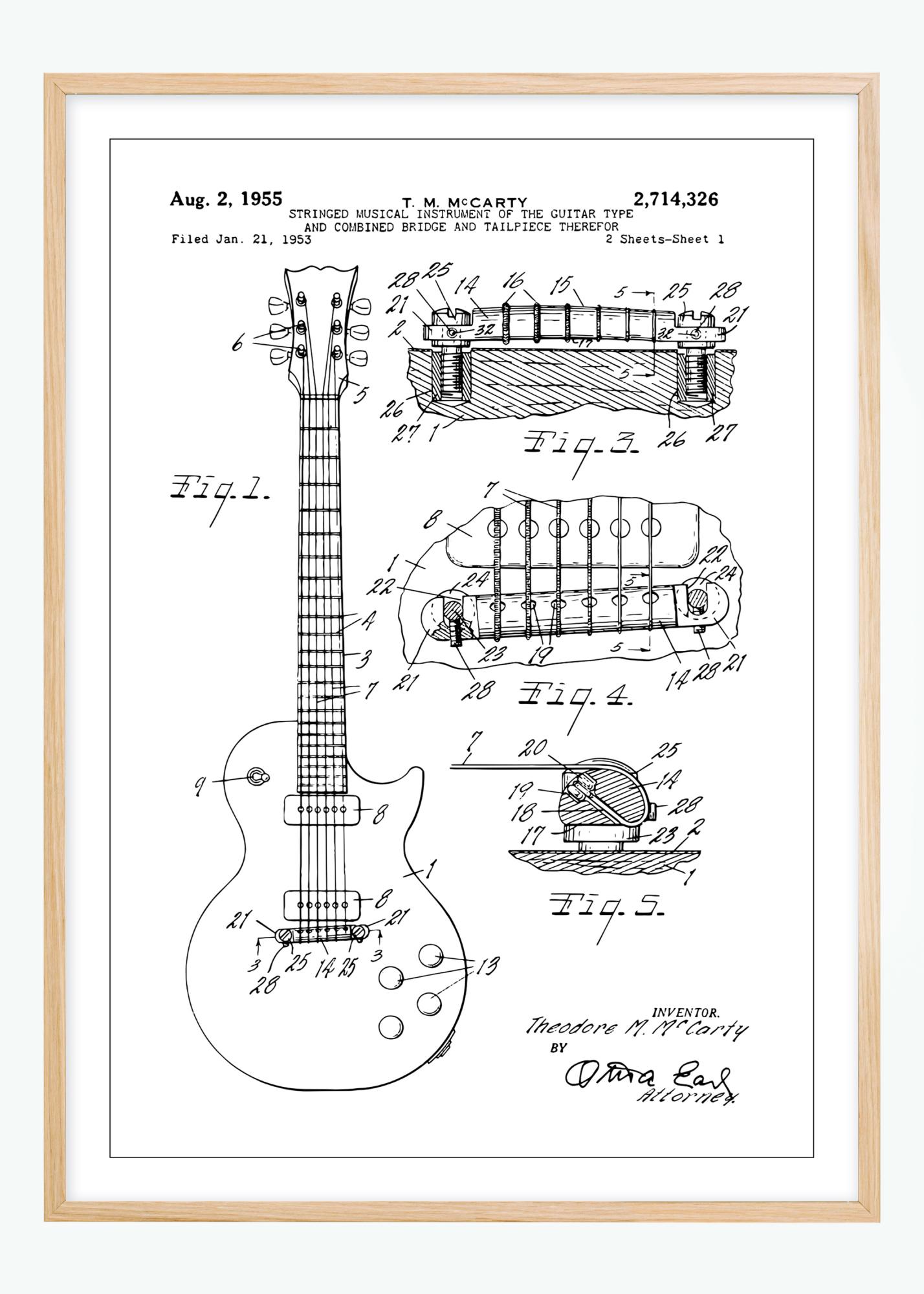 This patent poster is an immense asset for music enthusiasts, guitar collectors, or as a decoration in a music studio or home. It is also a homage to music innovation and design genius. To reach those who appreciate such craftsmanship, keywords like 'guitar patent', 'musical instrument poster', and 'vintage guitar design drawing' can be used. This artistic depiction of a musical instrument is not only a visual delight but also an inspiration for musicians and designers.