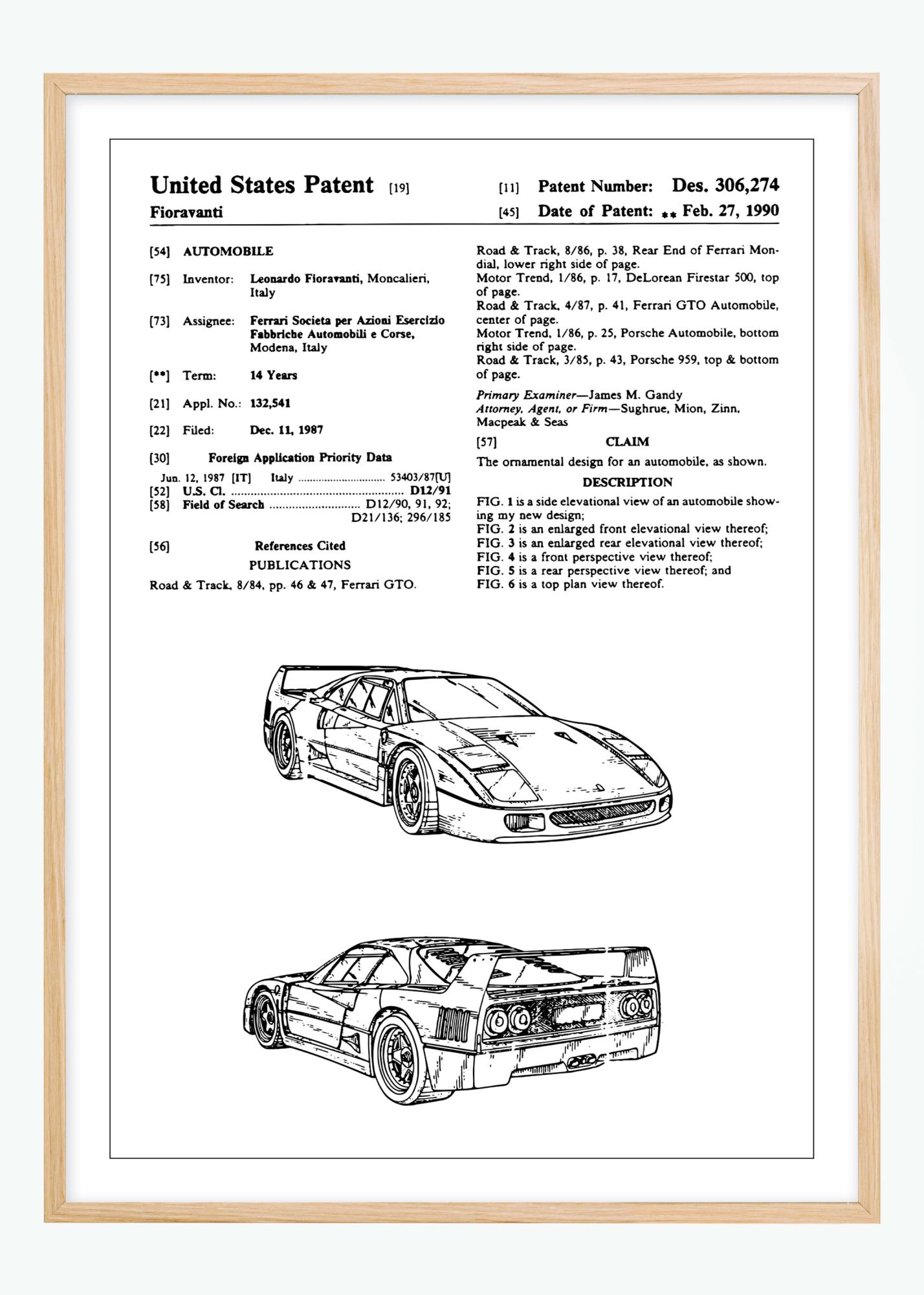 This elegant patent poster displays a car designed by Leonardo Fioravanti for Ferrari, one of the most iconic names in the automotive industry. Granted on February 27, 1990, under patent number Des. 306,274, the document represents the aesthetic design of a Ferrari F40 that captures the essence of speed and innovation. The patent's illustrations highlight the striking lines and the aerodynamic silhouette that have come to define the brand.