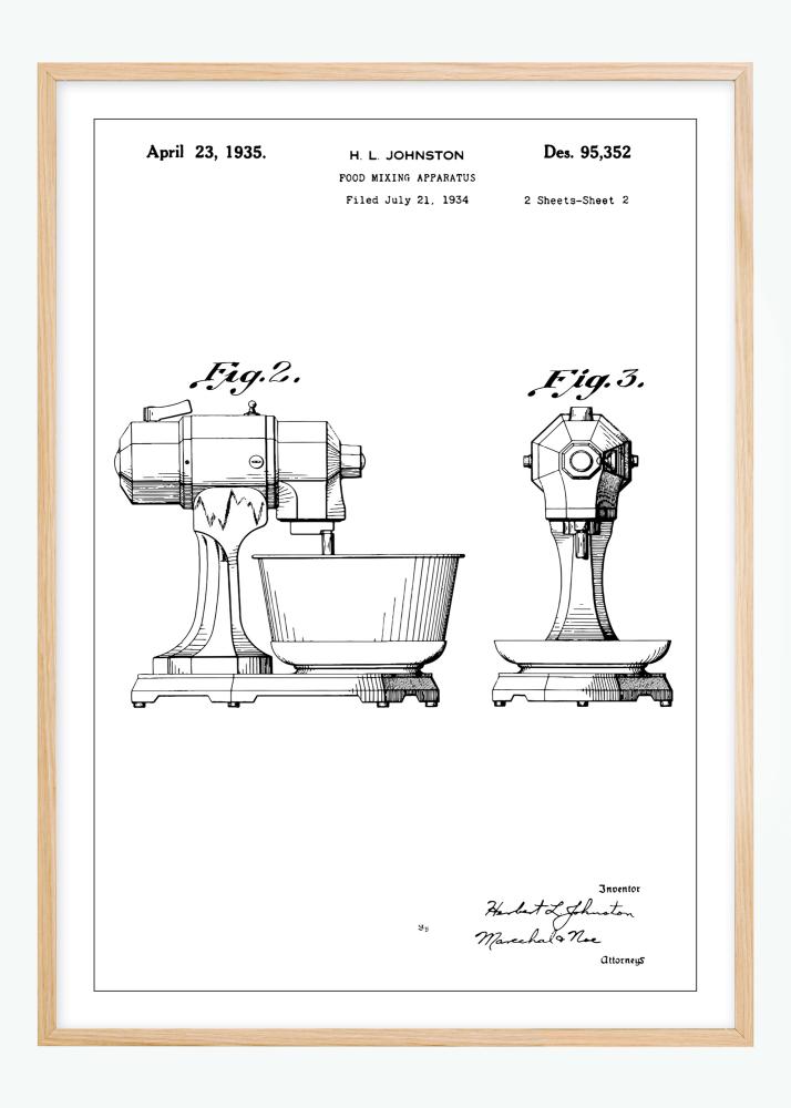 This meticulously detailed patent poster depicts a food mixing apparatus, an essential kitchen tool that revolutionized the art of cooking. The patent, designed by H.L. Johnston on April 23, 1935, under number Des. 95,352, illustrates the early design of a stand mixer, a household appliance that has become indispensable in modern cooking. The figure shows the apparatus in two views, providing a comprehensive understanding of its construction and function.