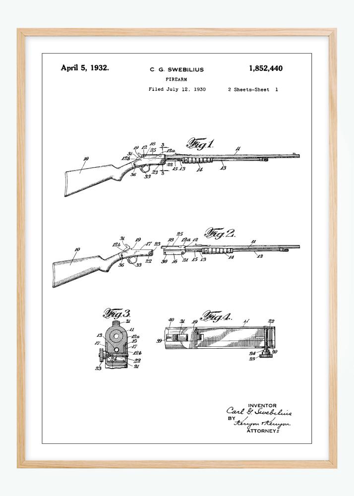 This patent poster depicts a technical drawing of a firearm, granted to C.G. Swelius on April 5, 1932, under patent number 1,852,440. The detailed illustrations on the document show various aspects and mechanisms of the firearm, including a side view, top view, as well as detailed cross-sections of the trigger mechanism and cartridge storage. This type of drawing is central to understanding the engineering work behind the development of firearms during the early 20th century.