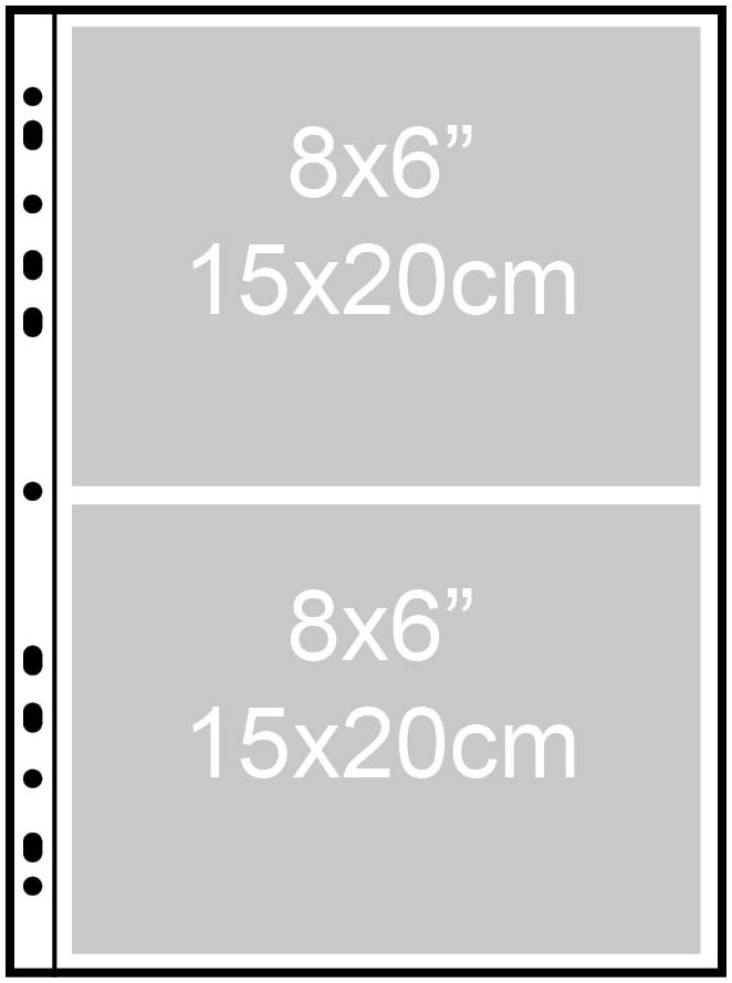 Practical photo pockets with space for a total of 10 landscape pictures (2 per album page) in sizes up to 20x25 cm. The album pages are made for use with ring-binders in the Super A4 format. The photo pockets are, of course, acid-free, and therefore guaranteed not to damage your pictures.