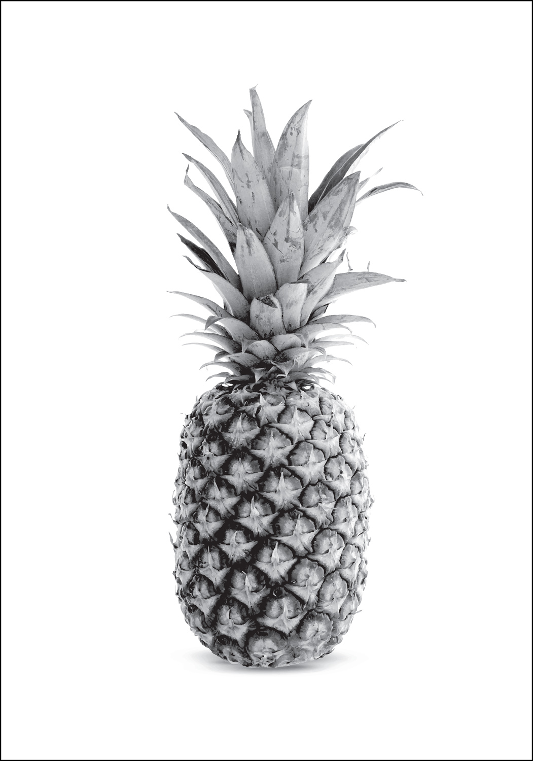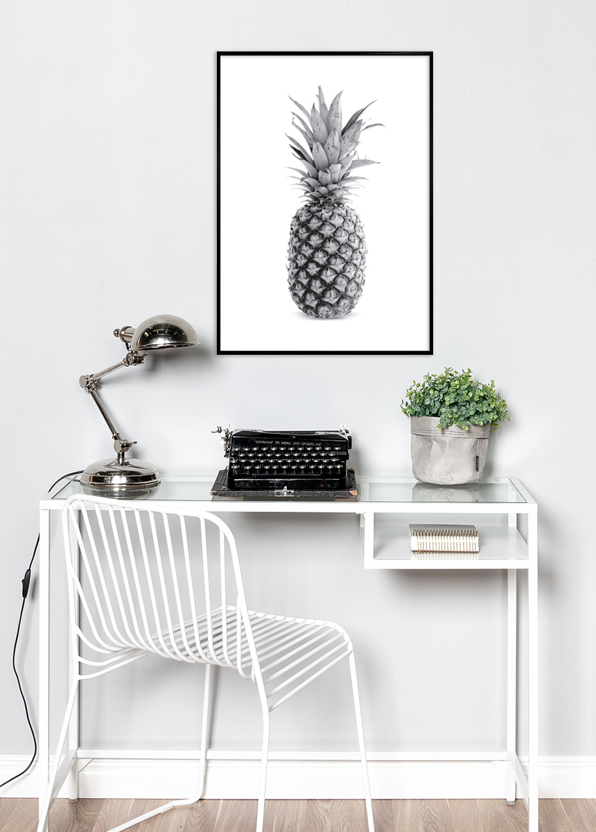 Poster with the interior design enthusiast's favourite fruit, the pineapple, perfect for those who want to be design-conscious without constantly having to buy new fruits. The black and white motif ensures that the poster fits in with all interior styles and rooms in the home, and the print also looks good in a public setting. Complement with a thinner, solid-coloured picture frame that does not compete with the motif and that fits into the environment where the picture will be hung.