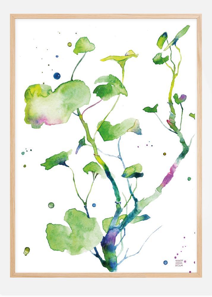 A fun, botanical print of a green plant. Set on a white background, the delicate touches of mauve and pink lighten up this print. Blue paint splashes have been scattered around the picture to add a fun touch. Liven up any wall when you hang this picture in your home.