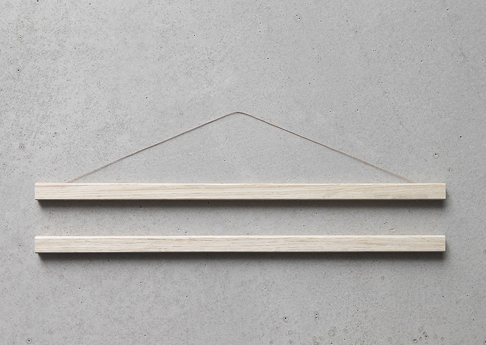 Unique poster hanger with two functions in the same product. Use as a classic poster hanger with string on the wall, or remove the string and attach the strip directly to the wall.
