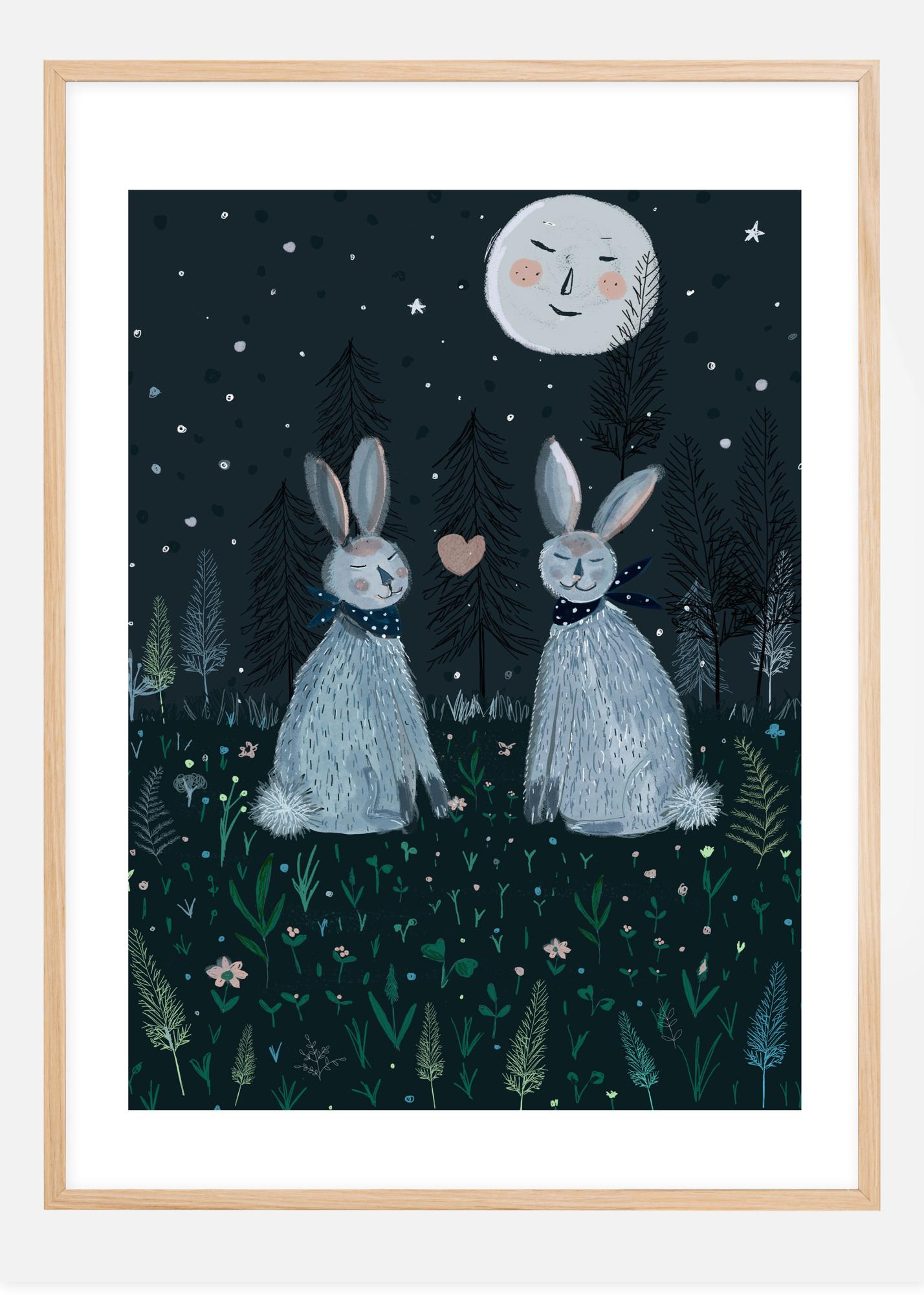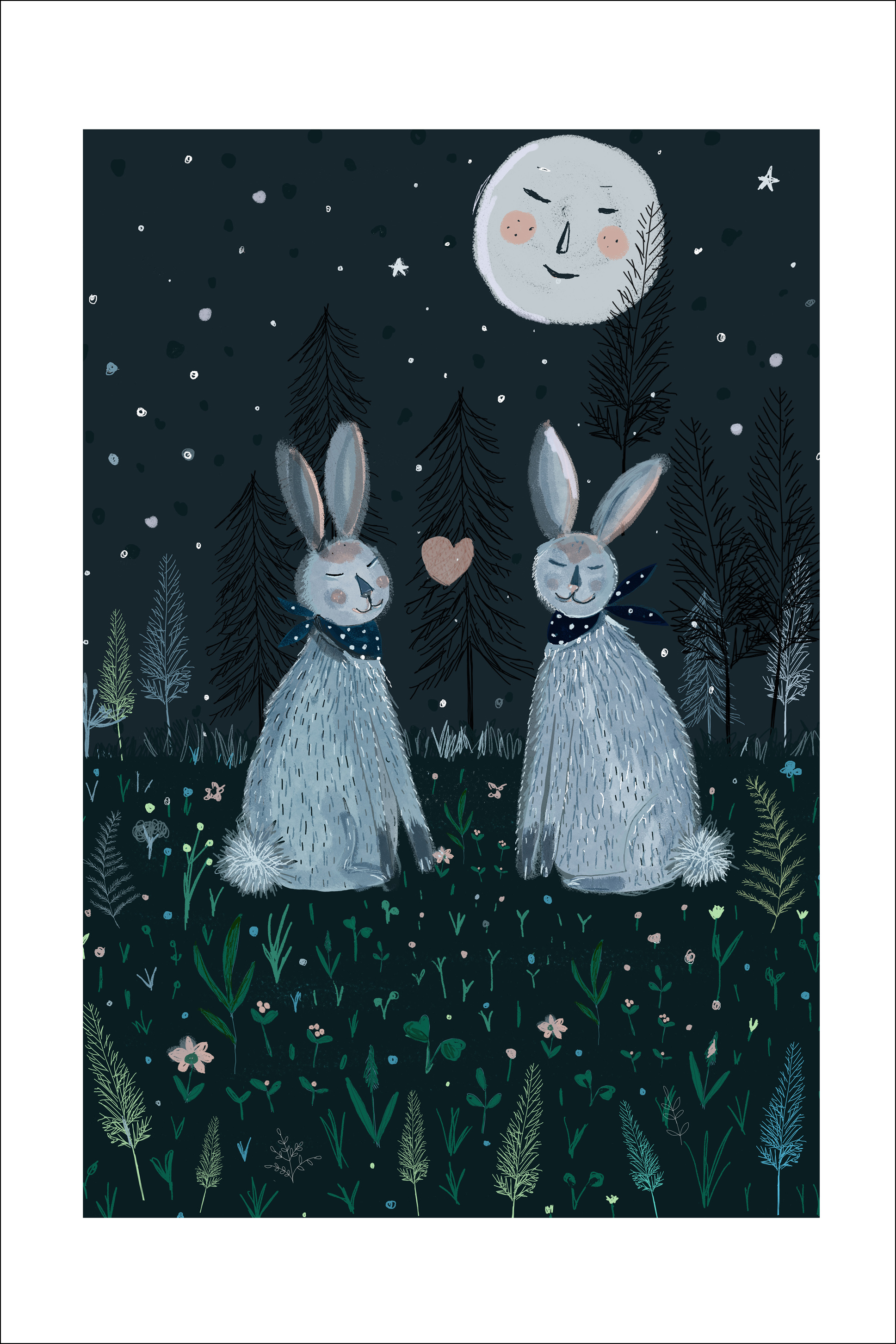 An fun portrait with the moon and forest rabbits fast asleep. The stars shine brightly as the ground plants stand cool in the evening atmosphere. With headscarves tied round the rabbits’ necks and a heart positioned between them, this is a perfect print for anyone in love.