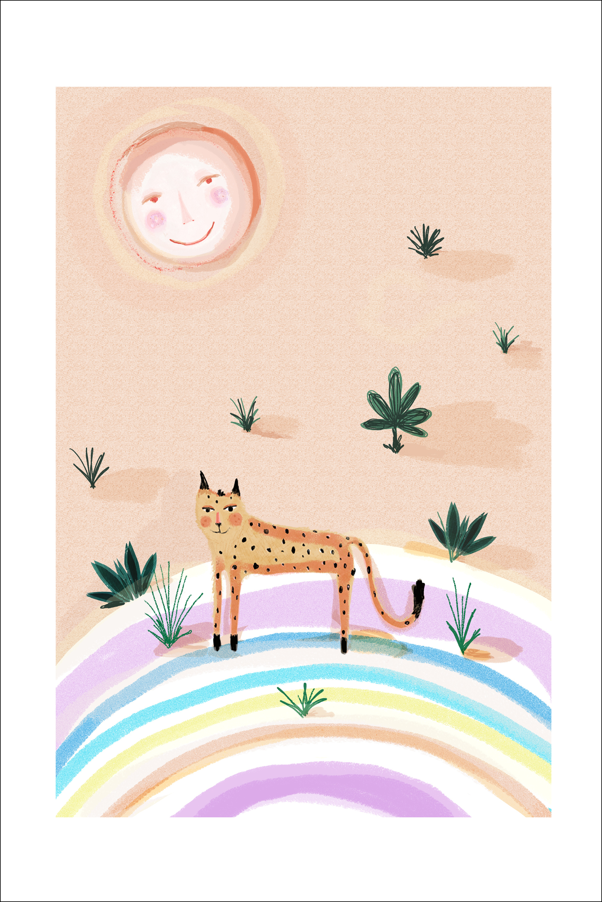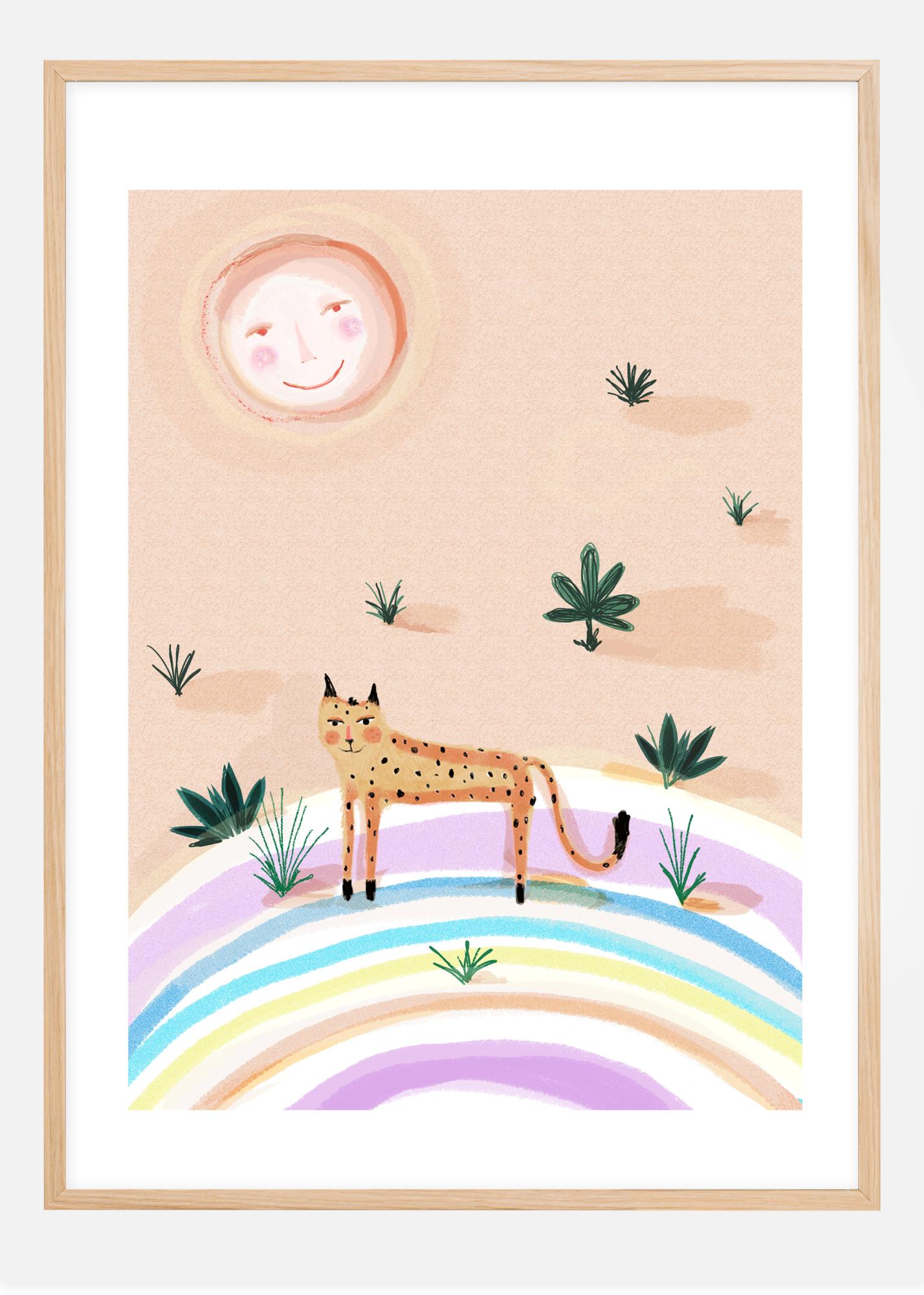 A fun desert poster with a leopard and the sun both smiling. Positioned on a multi coloured surface, the small, thin leopard is surrounded by small desert plants. An ideal print to hang in your child's bedroom to create a happy atmosphere.