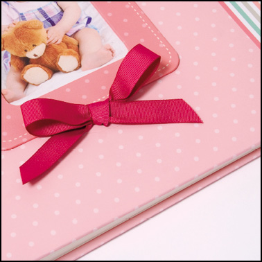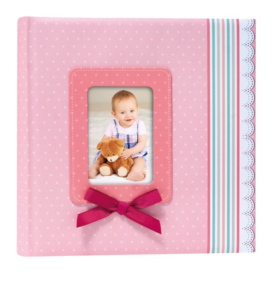 Order a sweet-as-sugar photo album for the sweet-as-sugar baby! This is an album that comes in pink with details in other beautiful shades. The cover is pastel pink with light dots. On the front is a space for a picture with a decorative surround in darker pink with light dots, white seams and a dark pink fabric rosette. Down one side runs a wide band with a white ruffle pattern on one end and pink, turquoise, grey and salmon pink stripes. The first page has a cute picture with dots, a washing line, the word "Baby" and four lines that you can write on. Also inside, you'll find 40 white pages for you to stick pictures and other nice memories on.