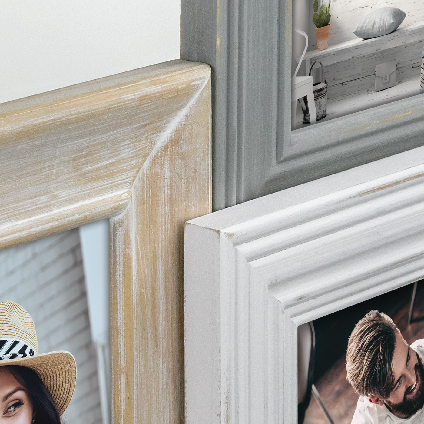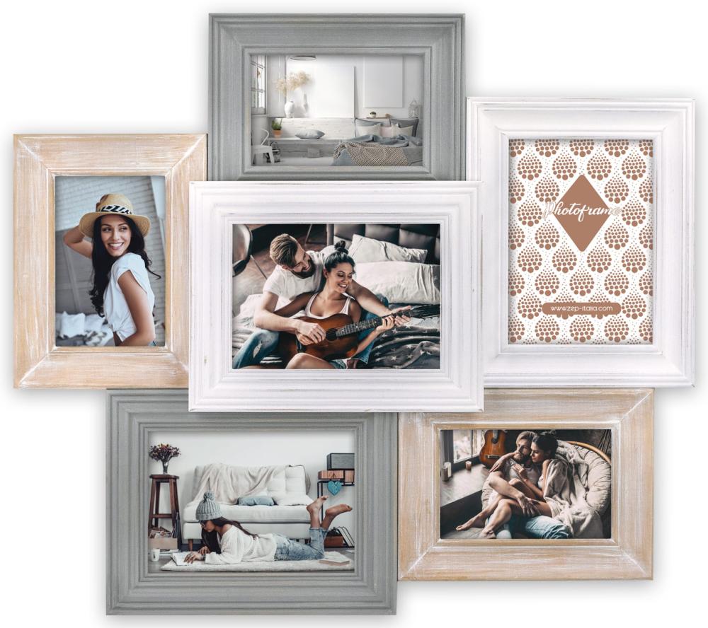 Beautiful collage picture frame with rustic look and space for 6 pictures measuring 10x15 cm and 13x18 cm. This collage picture frame has a beige, grey and white colour, and looks great when matched with other decorations and pictures on the wall. Made from wood. Comes with wall fixings.