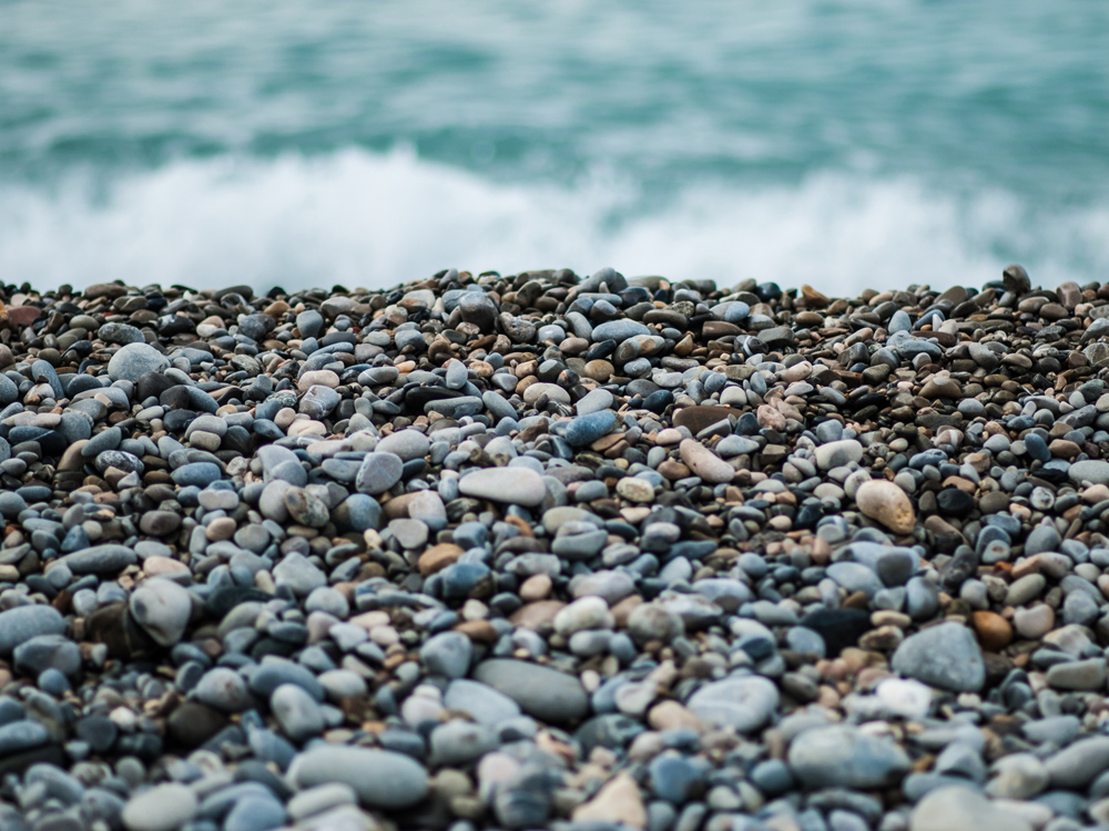 Hear the sound of the ocean waves from this poster featuring a beautiful stone beach in the foreground. The shallow depth of field creates an interesting image that draws the eyes into the picture. Can you find any rounded glass piece among the stones? The grey-blue colour scheme goes well with a slim frame against a light wall, preferably with marine accessories to complement it.