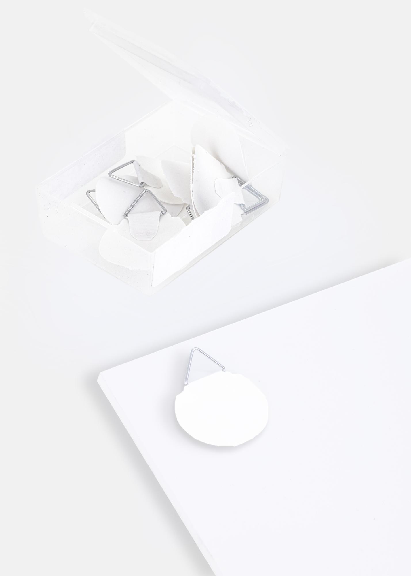 A hanger that is well suited for hanging lighter items on the wall, such as embroideries, tile plates, and foam board. Not suitable for frames as these become too heavy. First moisten the hanger and then attach it to the back of what you want to hang up. Place a weight on the hanger and let it dry for 24 hours. Perfectly suited for photo exhibitions where only the picture and passe-partout are used on the wall.