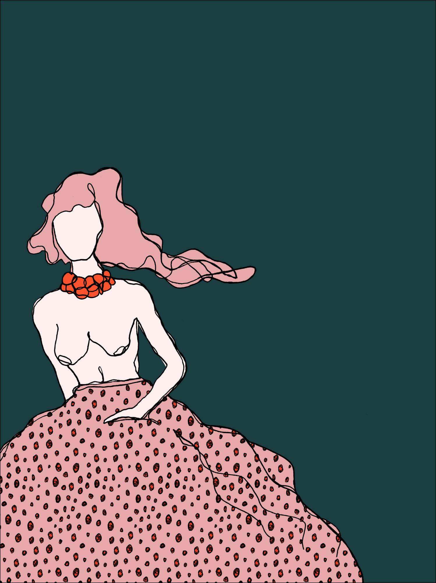 A fun poster of a girl on a teal background. The woman is topless, with a large spotty pink skirt billowing out. Her pink hair blows sideways in an unseen wind. Bright orange beads decorate her neck. One hand in her pocket, this sketch of a woman has movement with a casual vibe, perfect for an effortlessly cool wall hanging.