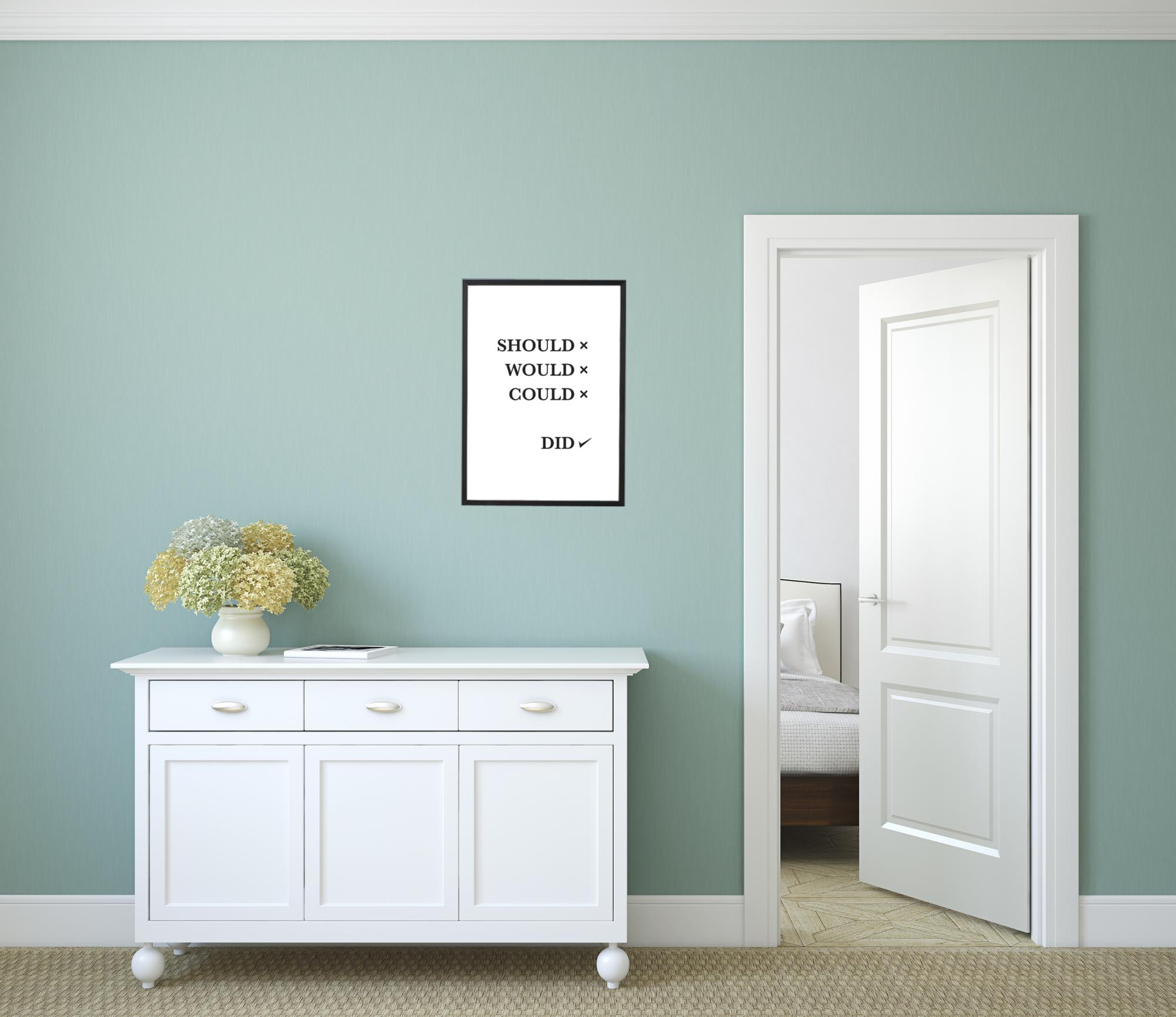 Why complicate all the brilliant ideas you get with inhibiting thoughts? Just do it! With this poster on the wall, there are no more excuses. The poster is white with black prints consisting of a list with the text "Should Would Could", where each word has a tick next to it. At the bottom, there's the word "Did" with a check next to it. The black and white design goes very well with a colourful frame. Since the poster is available in several different sizes, you'll find one for both the desk and the wall.