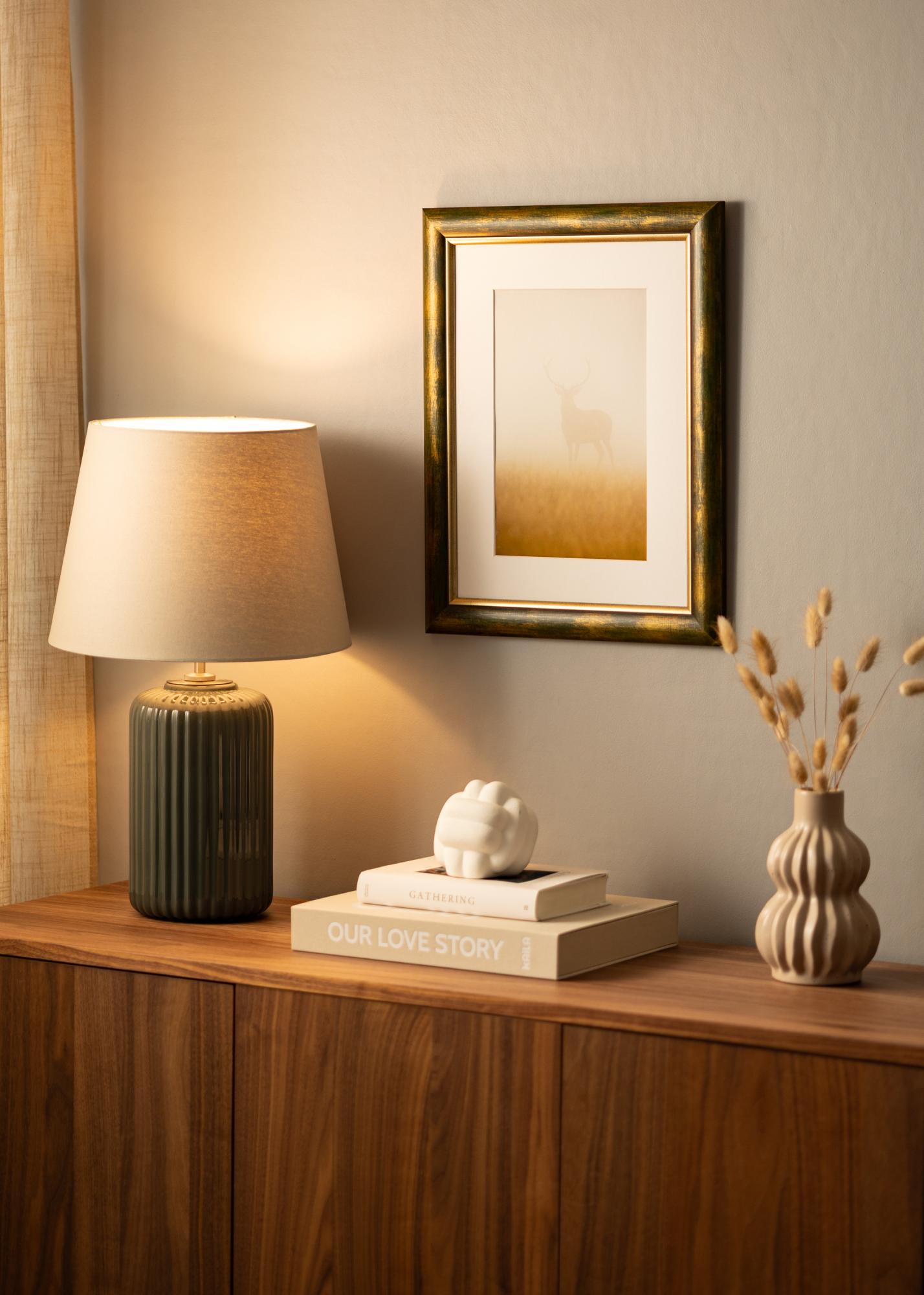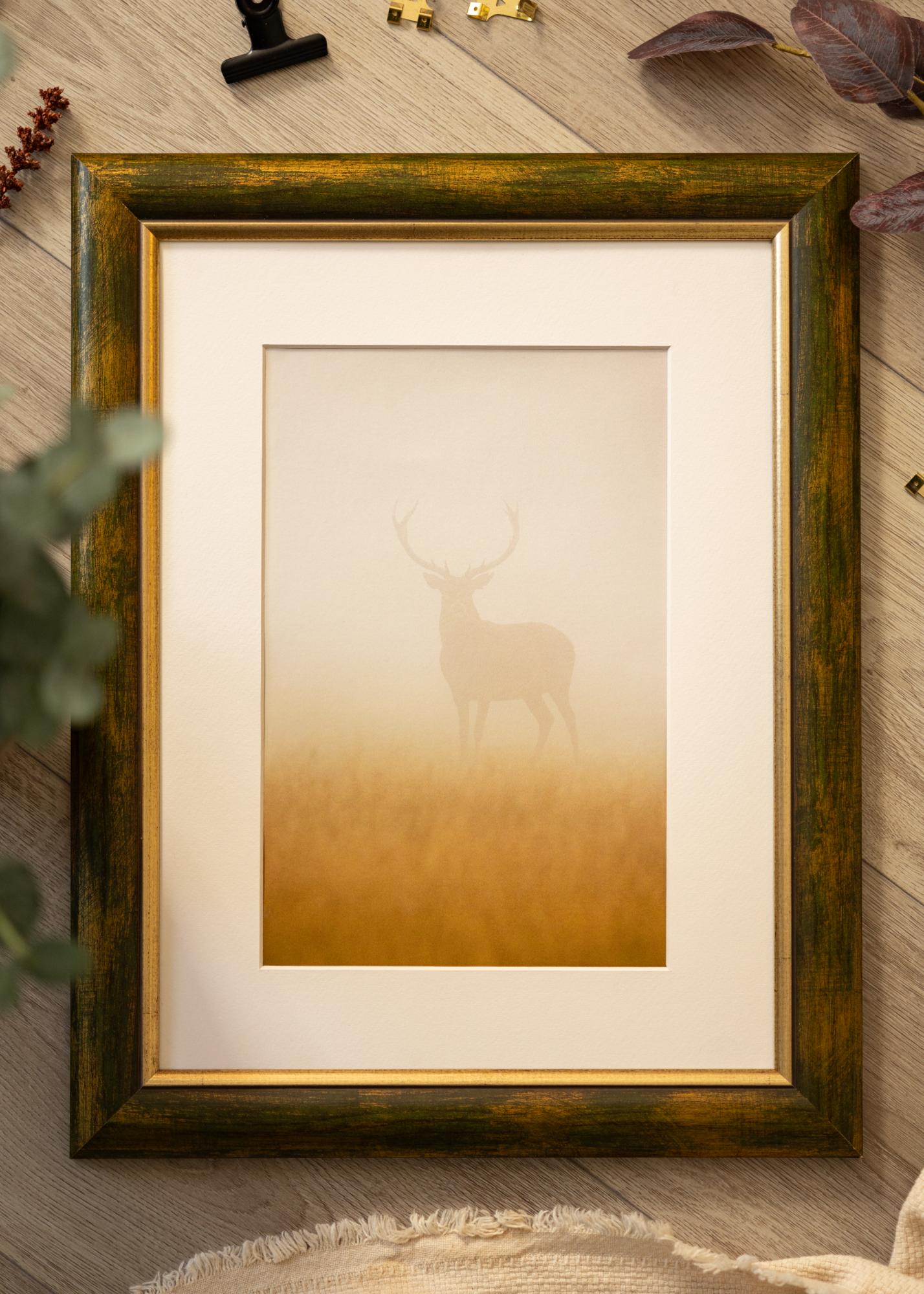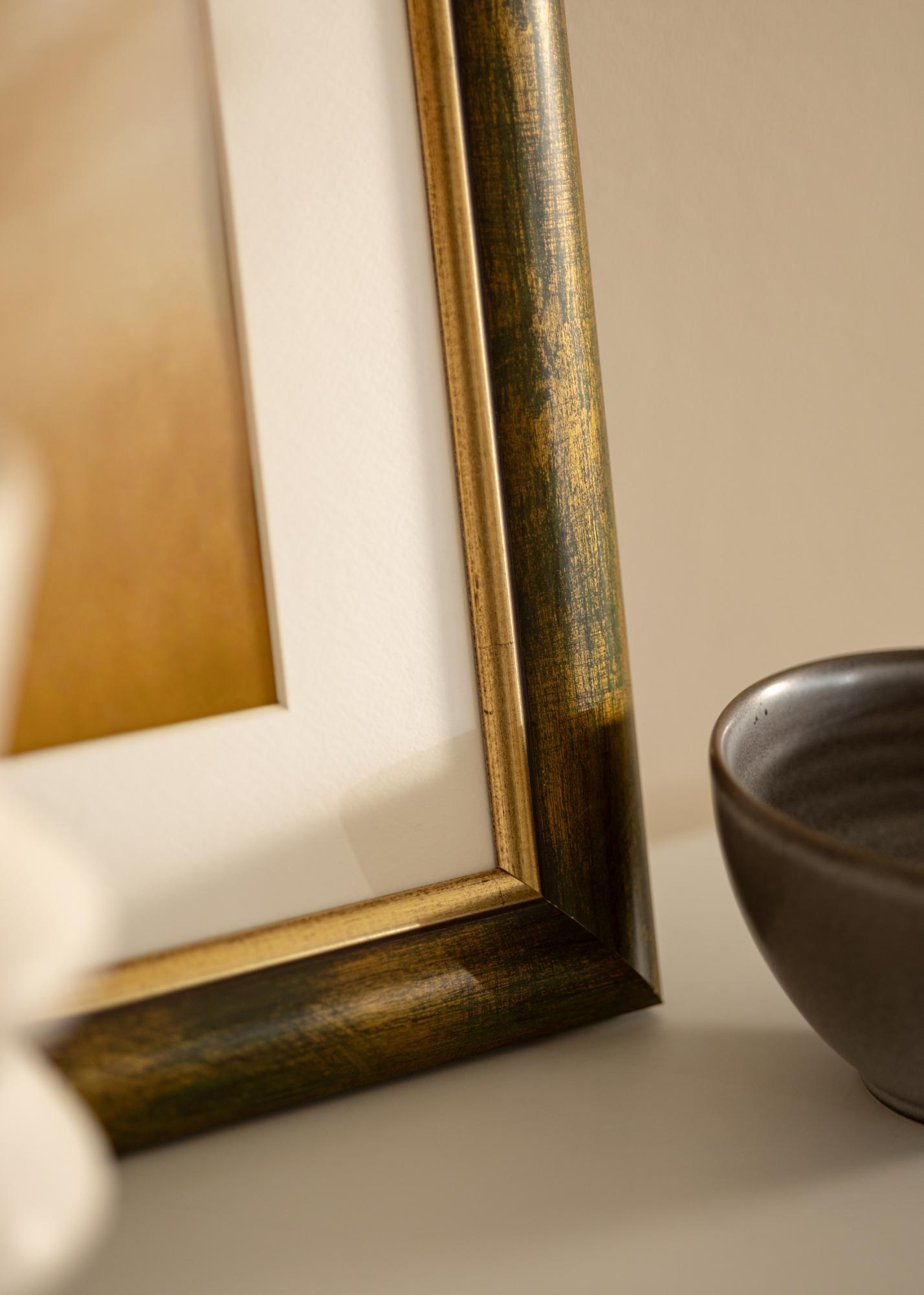 A timeless wooden frame made in Finland with a beautiful green wooden surface and a gold edge close to the picture. Gives your pictures a calming look. The frame has a wide 41 mm form and is extra deep at 19 mm.