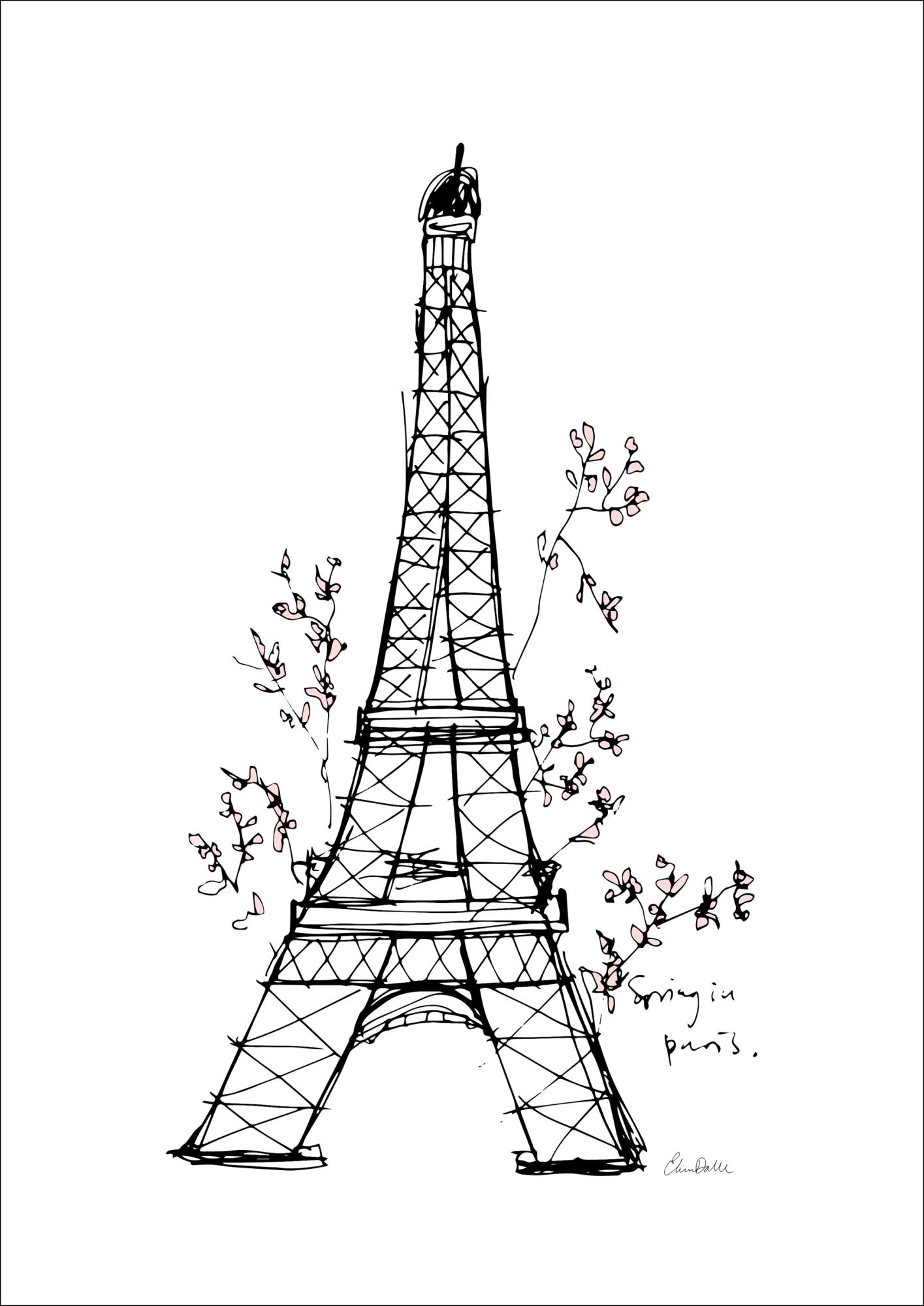A landmark poster featuring a simple ink drawing of the Eiffel Tower. The scratchy lines of this image, and off-centre lean of the tower, help to give this an illustrative quality. Large flowering branches fan out behind the tower to give that springtime in Paris vibe.