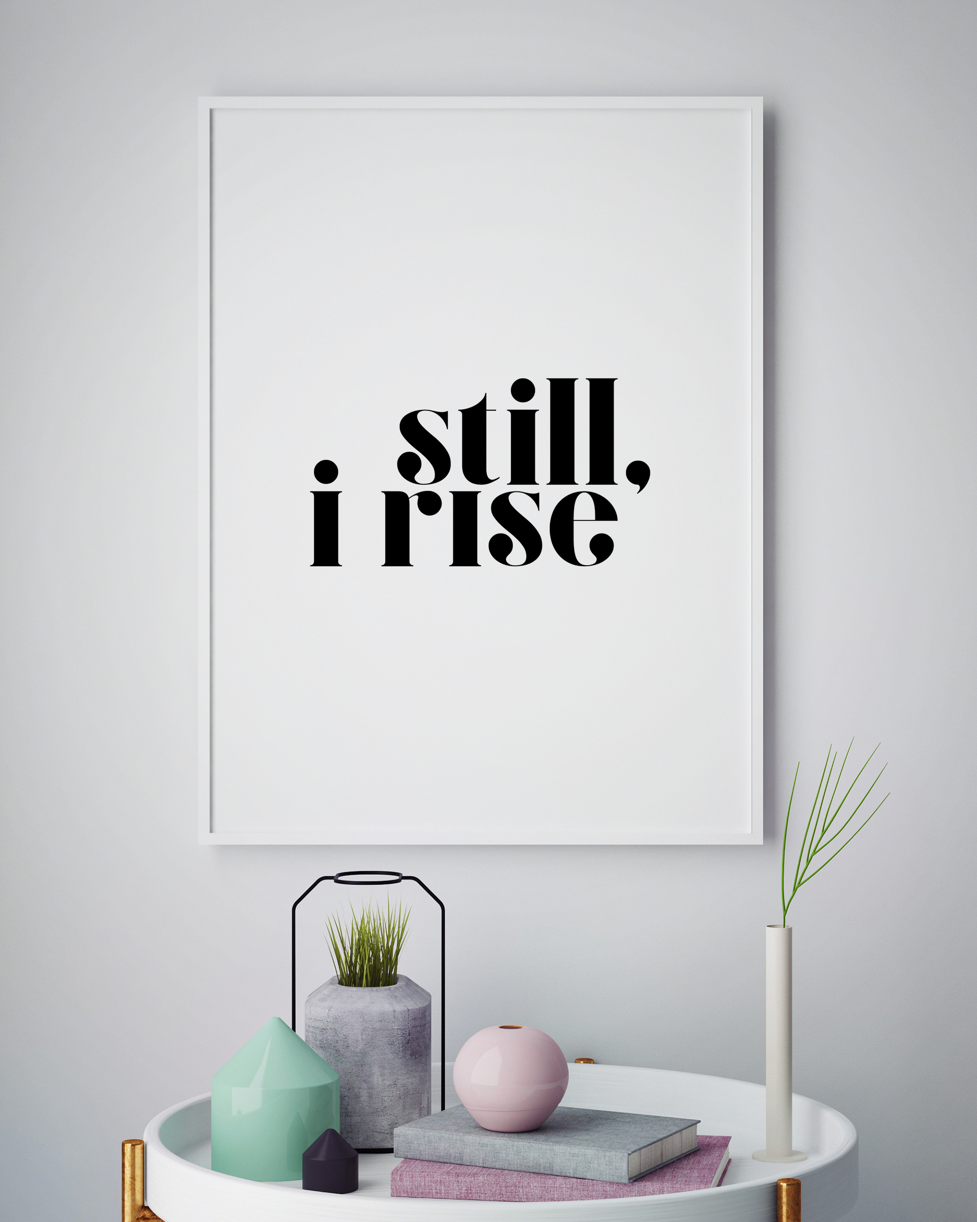 An inspiration poster with a daily affirmation quote in strong black letters against a plain white background. Give yourself the power to go on with the phrase Still, I Rise as you drink your coffee in the mornings and plan your day.