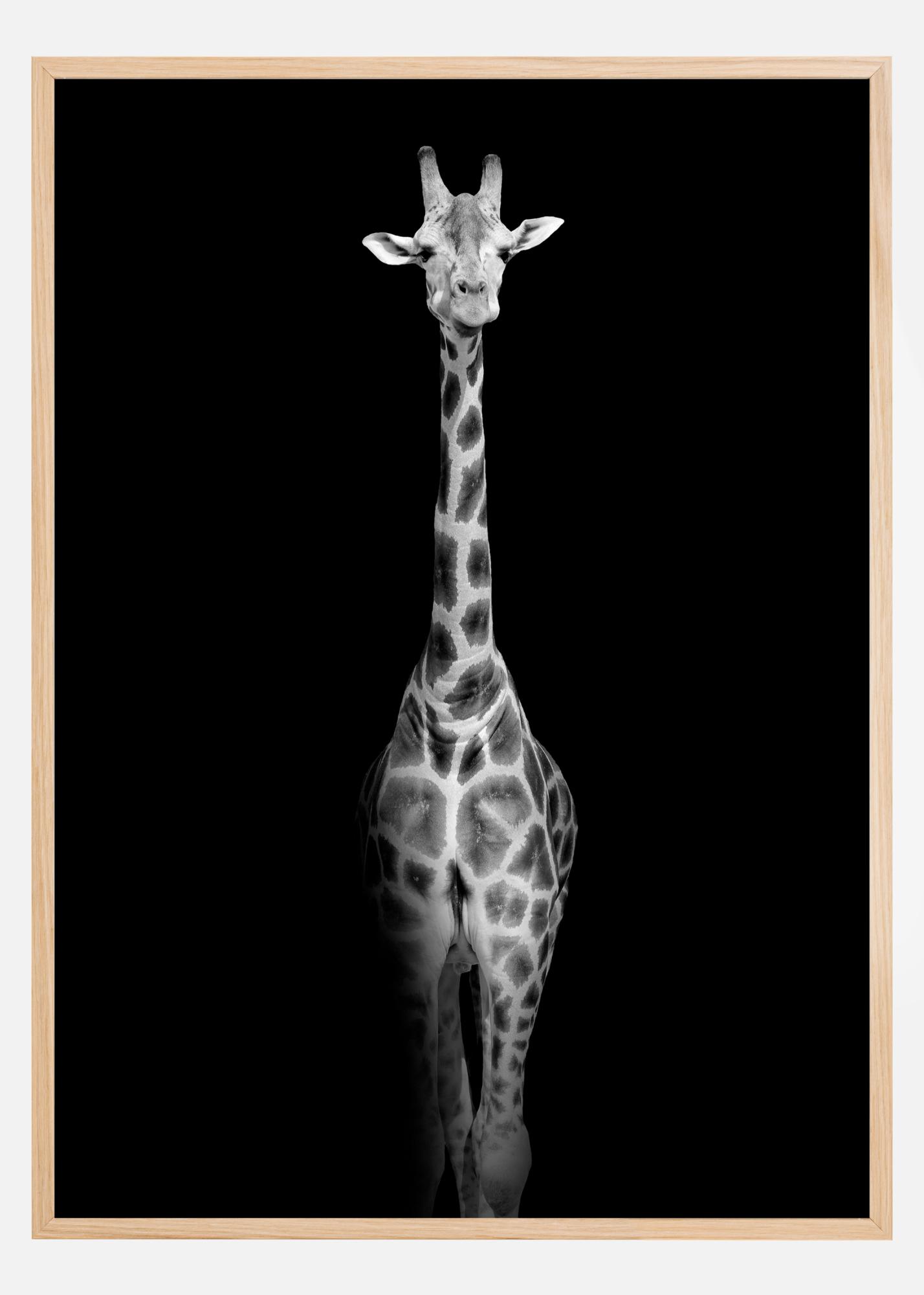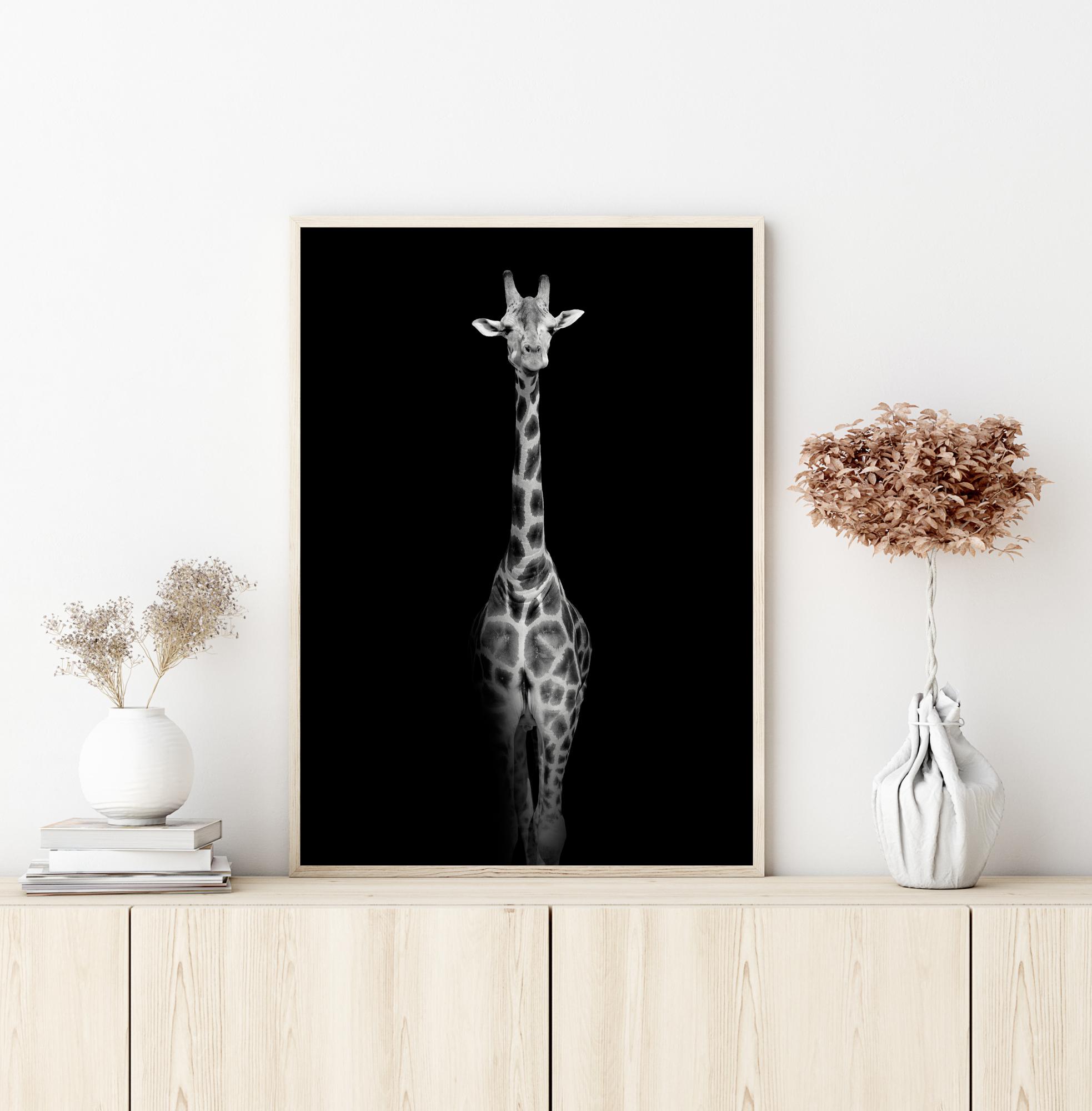 Photographic art in black and white of a tall giraffe stepping out from the image's black background. A sleek and contrast-filled poster with a lovely depth. Feel free to match with other of our fine animal posters in the same style for a picture wall in the same theme.