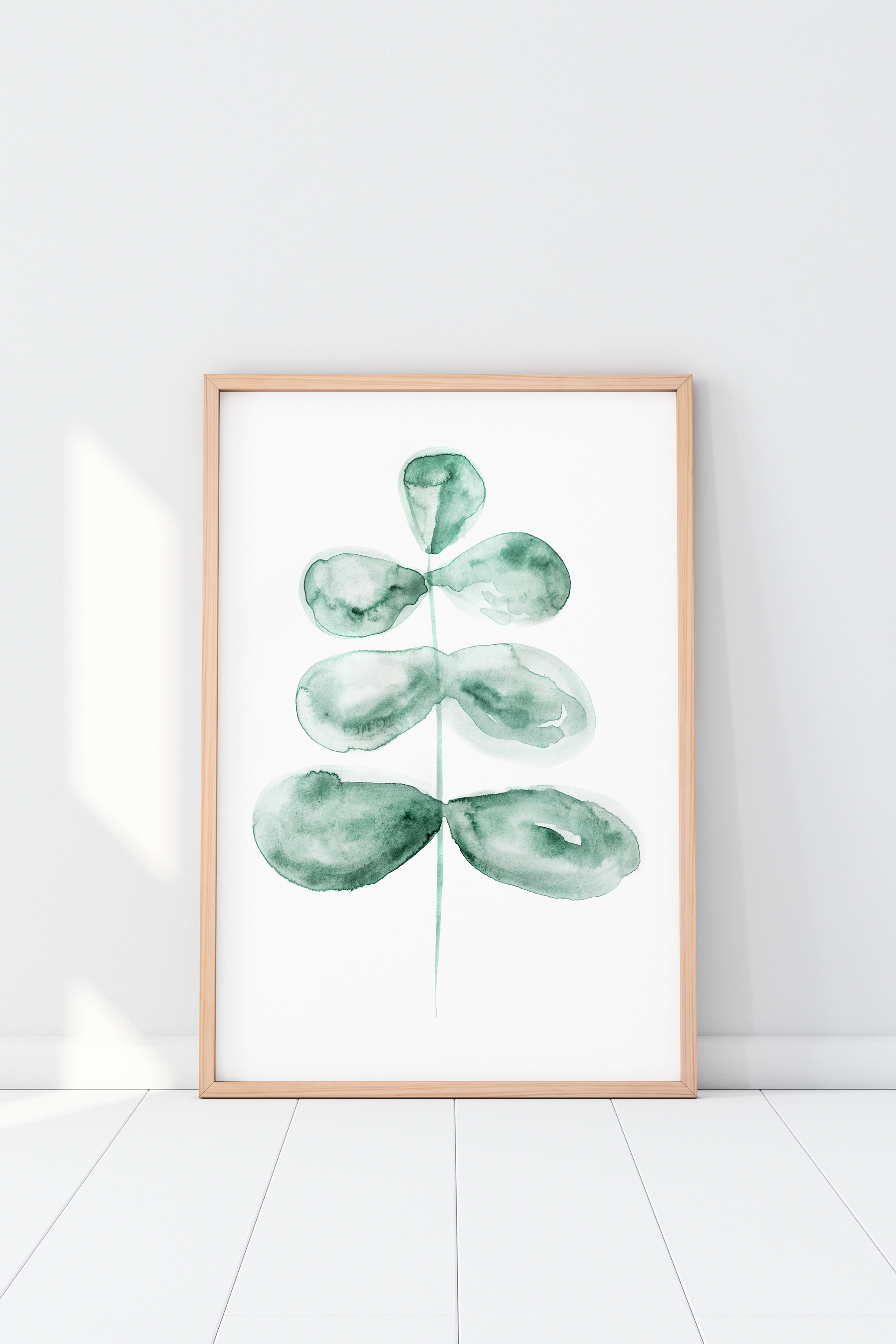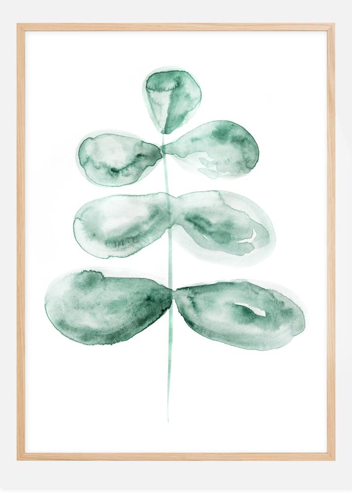 A simple poster of blue-green leaves painted using watercolours. The colour expands in each leaf leaving the edges soft and unfocused for a painterly look. A thin stem joins the leaves together in a cohesive whole in this elegant painting. Match with soft pastels to complete the summer feel.