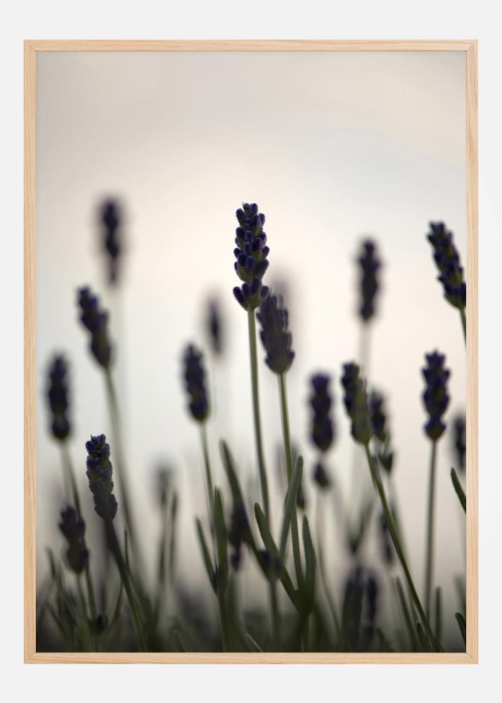 A floral poster of a close-up of lavender flowers in a field. Look closely and you can see the purple buds swaying at the top of the green stems. They stand tall against a simple white background, the perfect addition to a colourful room.