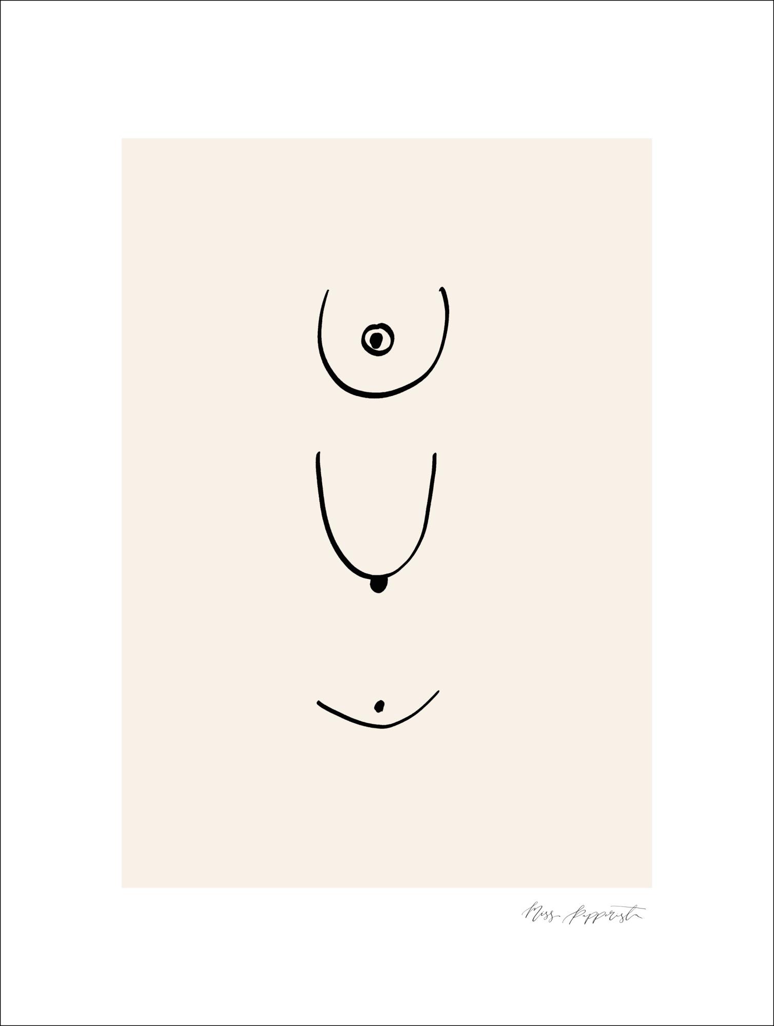 An abstract poster of different black lines on a white background. The simple lines look like they are drawing a woman's breast in different positions and from varying viewpoints. The lines are simple and elegant. See what you want to see in these curving shapes and dots.