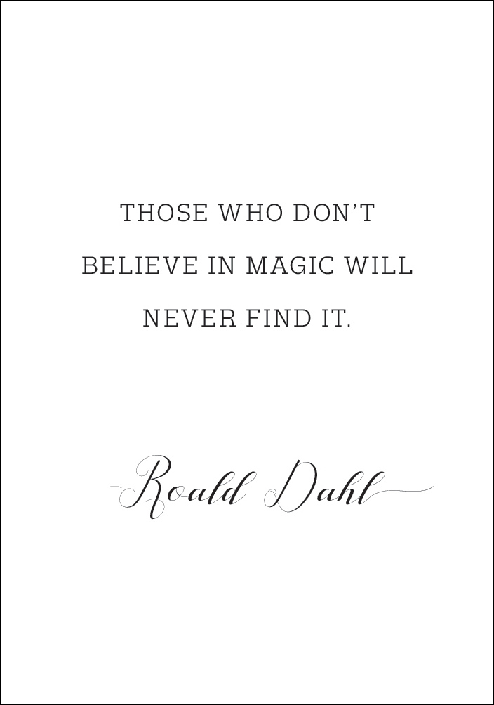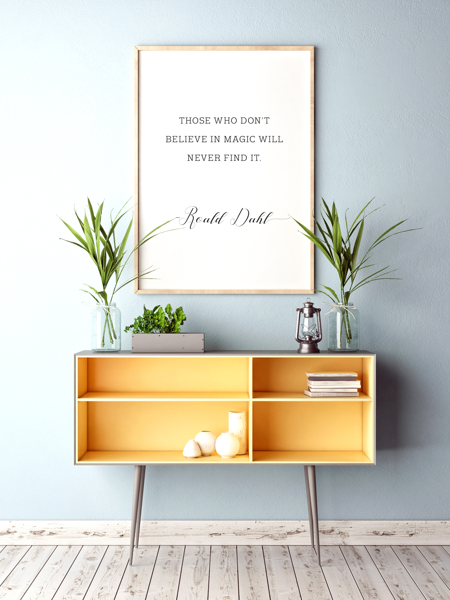 A fun inspirational poster with a famous quote from the author Roald Dahl. The quote, Those Who Don't Believe in Magic Will Never Find It, is written in an easy-to-read typewriter font with the name of the author in cursive below. The simple phrase in black stands out against the white background as a reminder to live by each day.