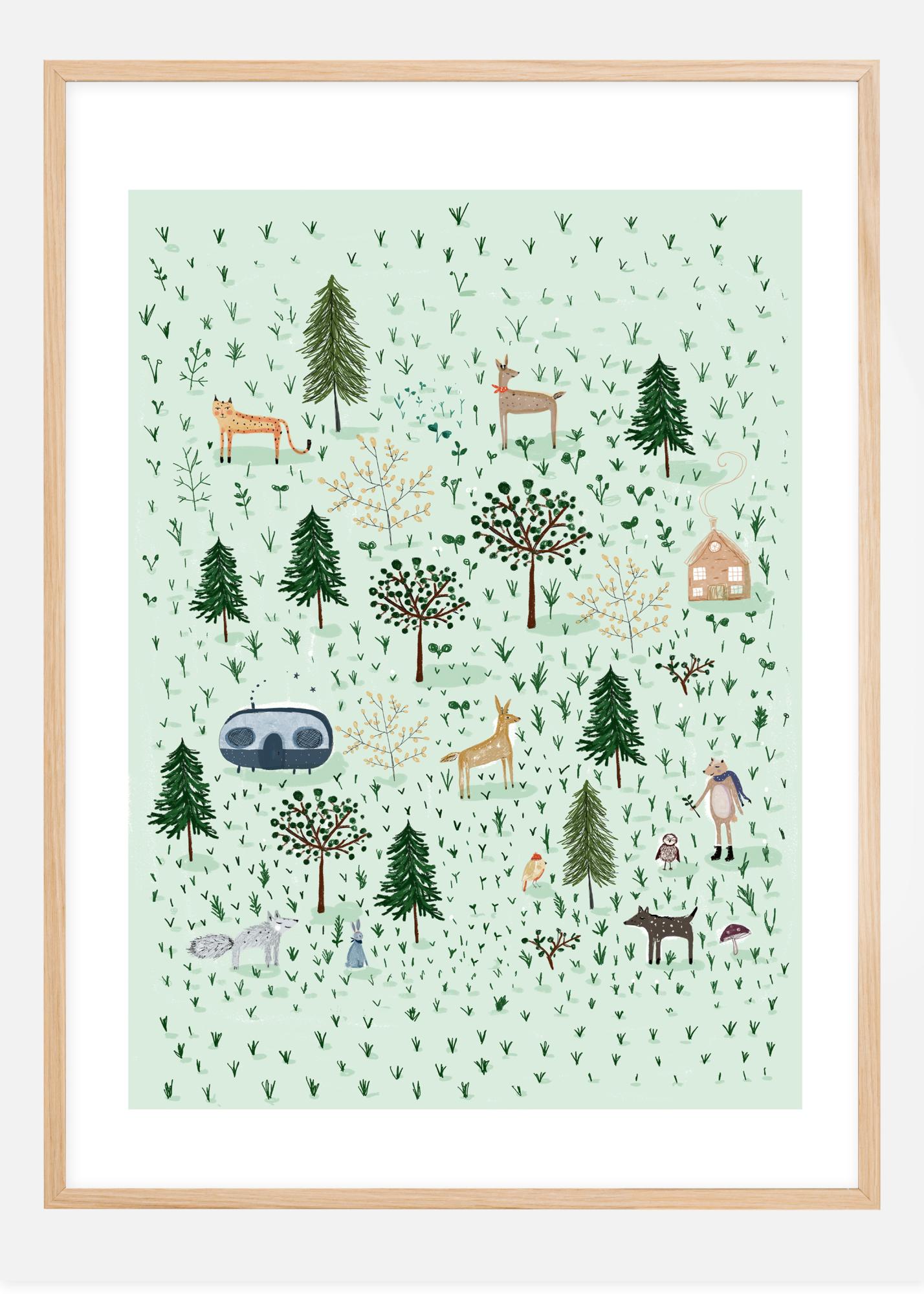 A fun poster of a tiny forest mainly filled with different animals. This is a graphical drawing with simplified trees, animals and houses dotted about. Nothing is to scale. There's a large upright fox in scarf and boots, a tiny house and massive caravan. It's kitsch, cute and reminiscent of a Christmas card. A great addition to any living space.
