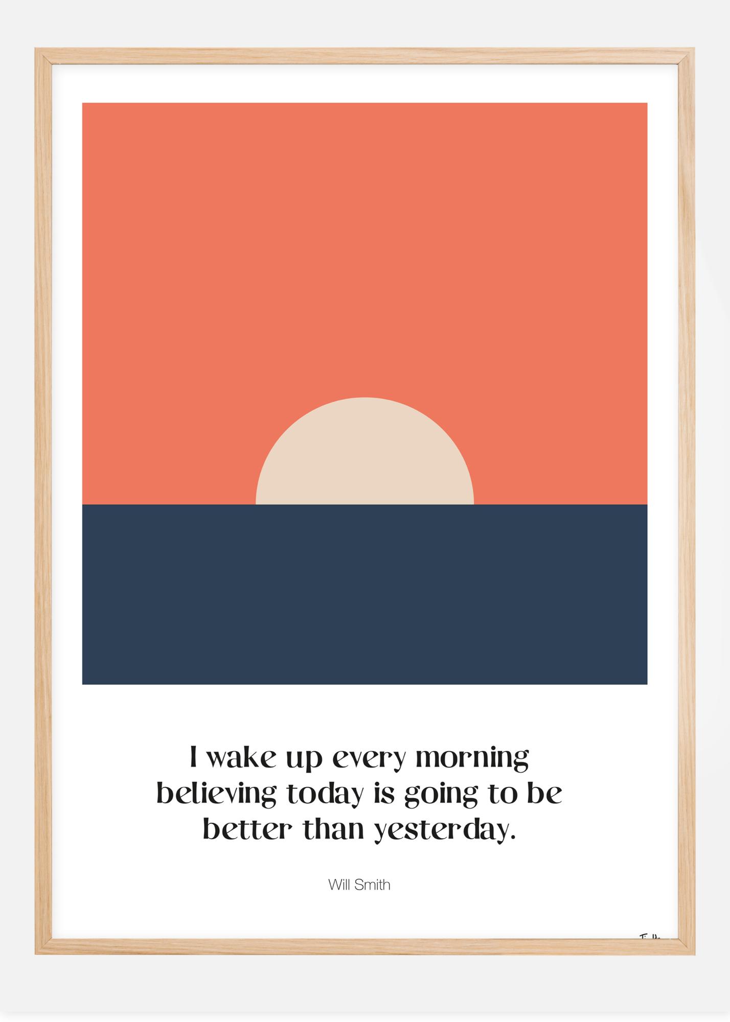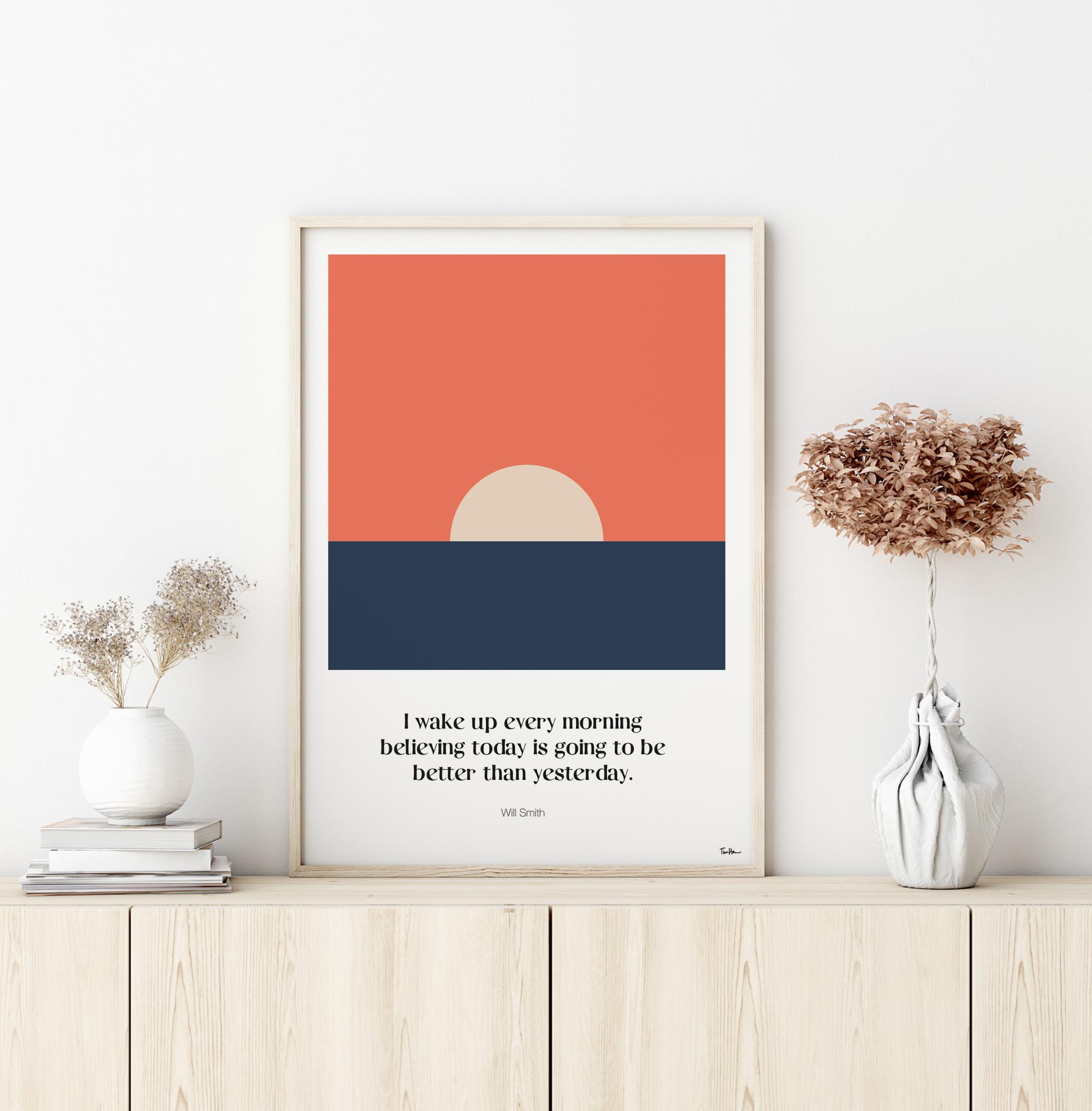 A text poster with Will Smith's quote "I wake up every morning believing today is going to be better than yesterday" written under a graphic illustration of a sunrise. A sleek and stylish poster created by Tim Hansson.