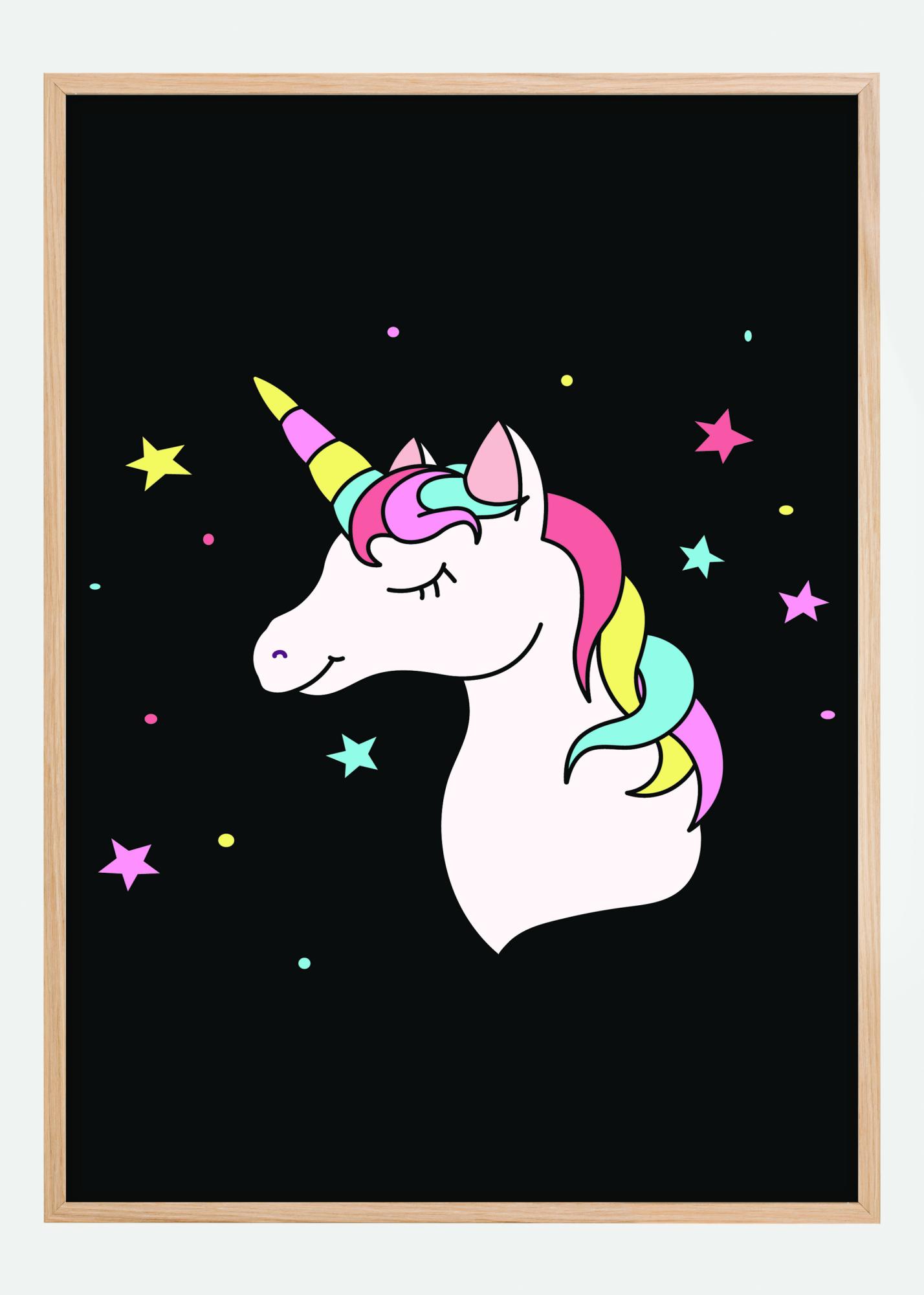 A cute poster of a childlike white unicorn on a black background. The unicorn has a pink, yellow and turquoise mane and horn. Stars in the same colours fill the black background behind to create a fun princess vibe. Add this to your child's bedroom for a fun quirky image that appeals to their fantasy side.