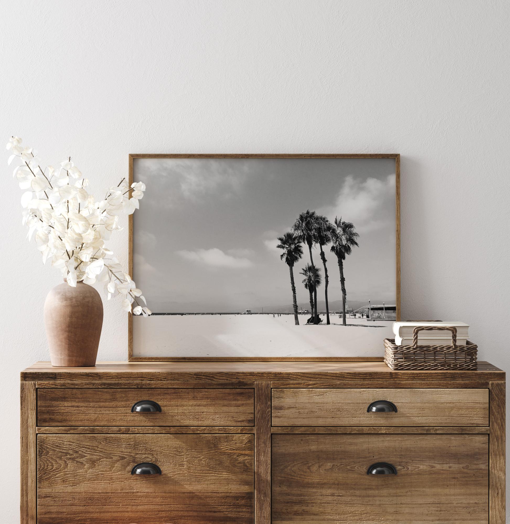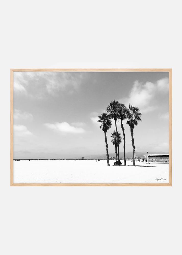 Here, photographer Saphira Consilio takes us to the white beach in Venice. Here, people share the place with beautiful palm trees, amusement parks, and the lifeguards' rescue towers. A fine black and white poster in landscape format.