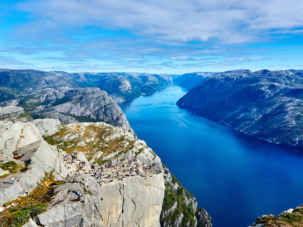 Photography with miles-wide breathtaking view over a deep fjord valley. The poster is in ocean blue tones with sunlit bare cliffs on both sides of the fjord, a magnificent landscape that suits the wall of someone who appreciates a beautiful natural scenery. Complement the picture with a picture frame that highlights the motif.