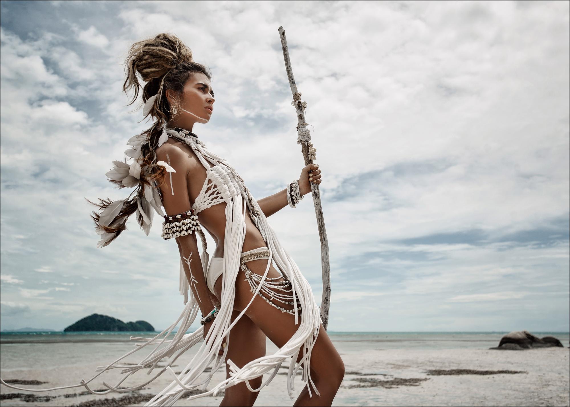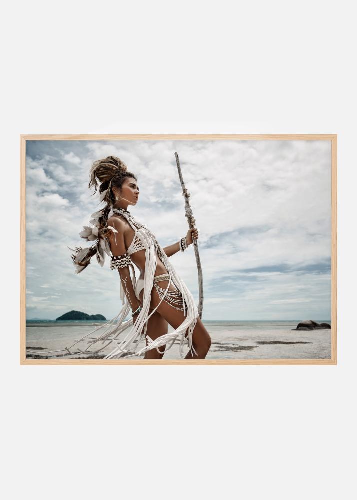 A warrior poster of a young woman posing on a beach dressed in light tribal clothes. Her tanned skin contrasts with the white flowing garments and jewellery covering her body and entwining through her hair. Her powerful pose is lent extra weight by the long pole she carries in her left hand as she stares off towards her enemies.