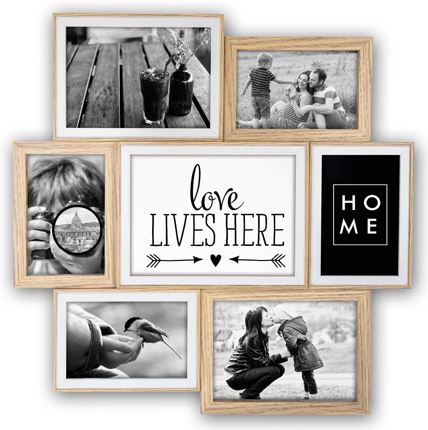 Stylish wooden collage frame with space for seven pictures of various sizes.
