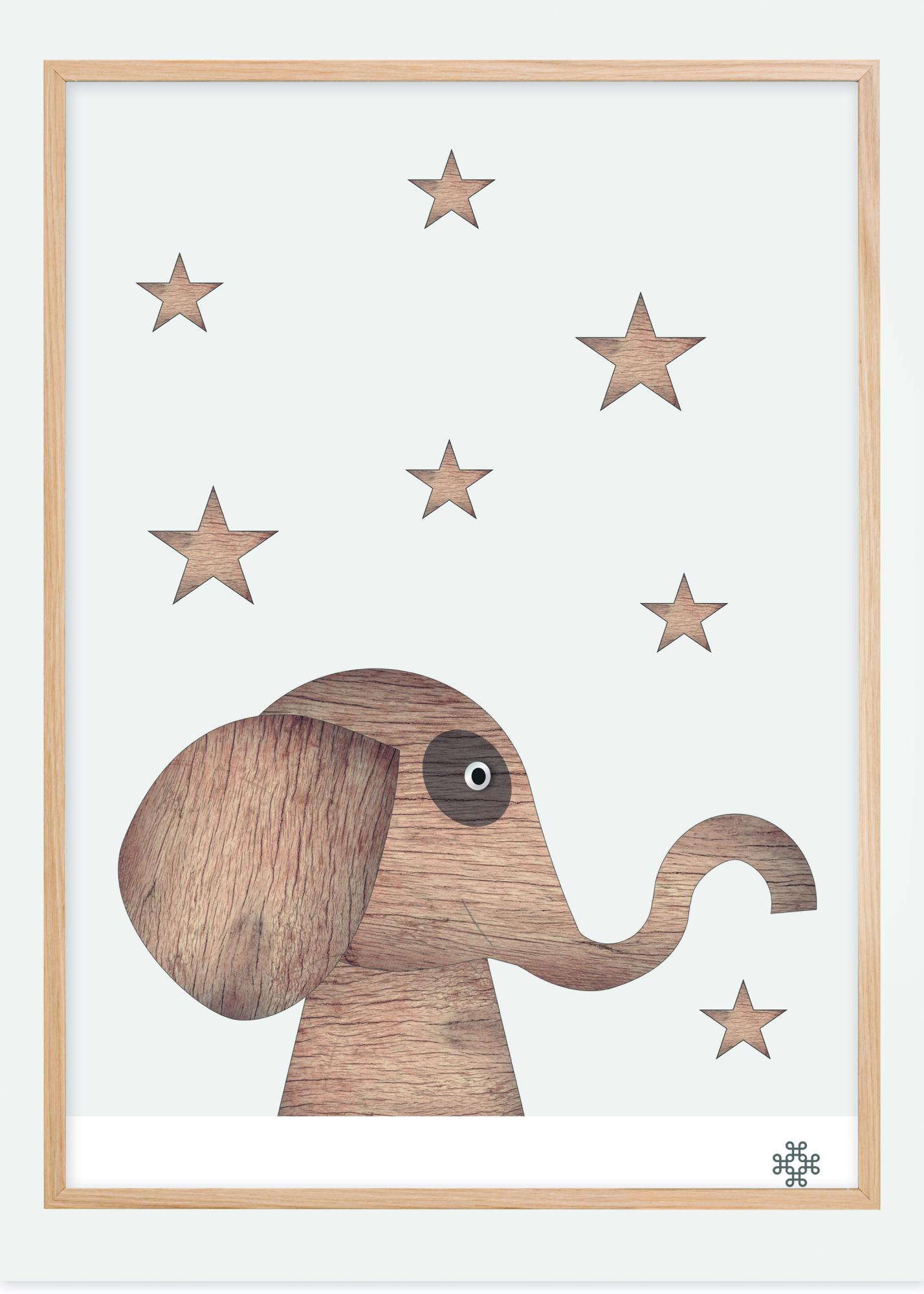 A wood design poster of a cute elephant surrounded by stars. The elephant is made out of images of wood grain giving it a textural effect. The stars are placed around to create this quirky image that would be a postive happy inclusion to any children's room.