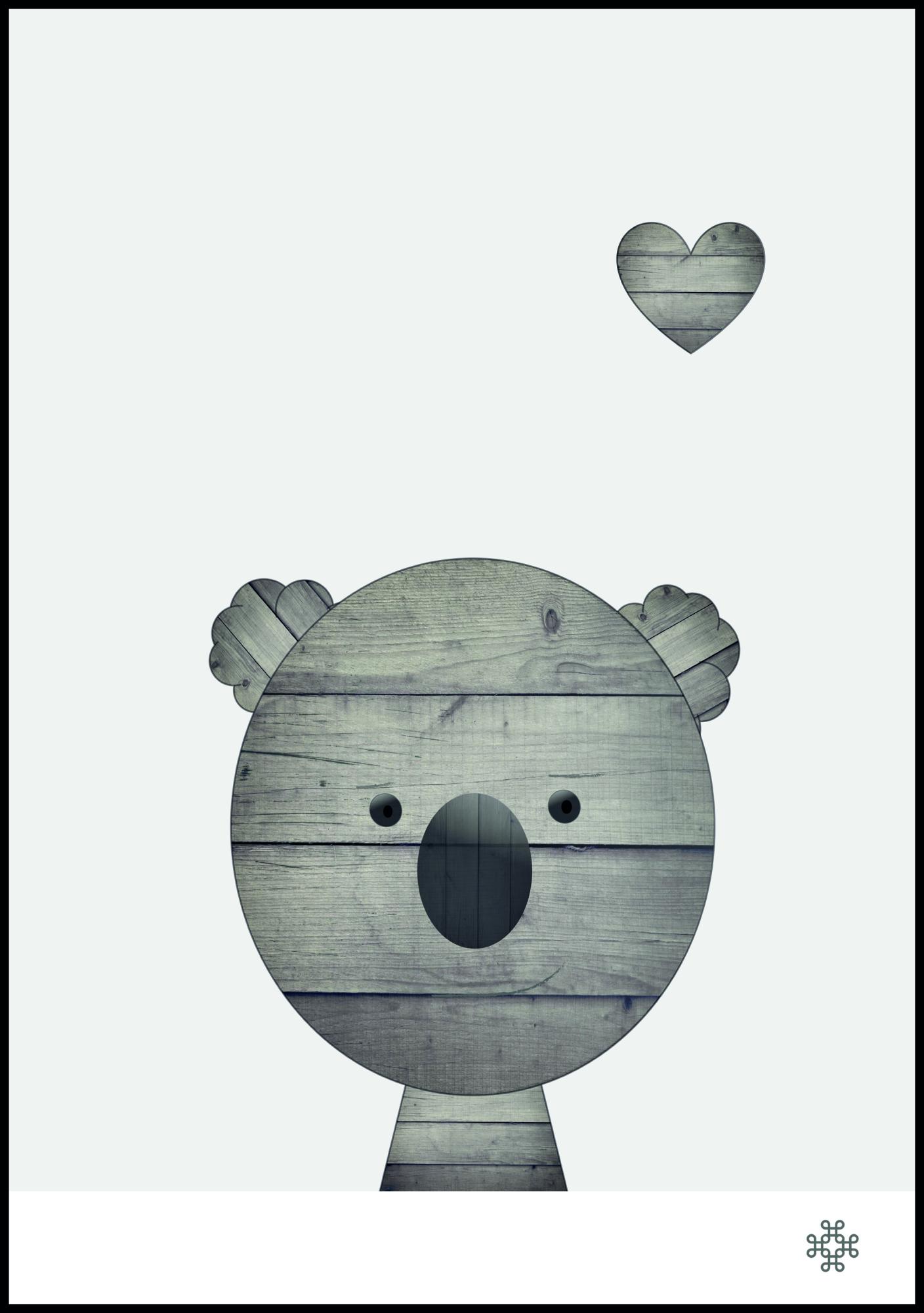 A black and white poster of a koala bear made out of wood grain images. Above the grey koala is a tiny little heart with the same wood texture. This cute little bear is giving you all the love and is a great addition to any room to get that loving feeling.