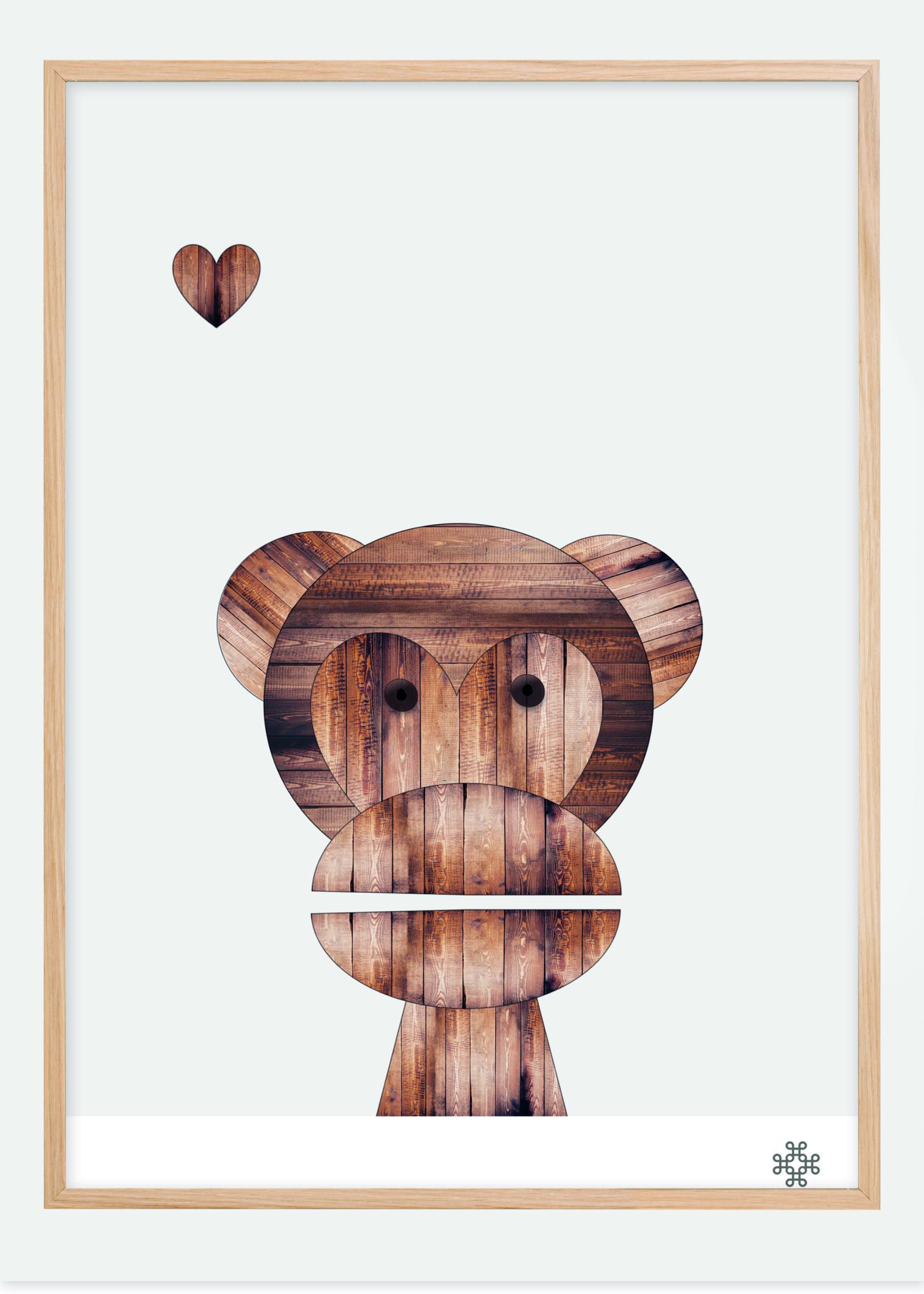 A wooden plank poster where the wood makes the shape of a little monkey. Above the textural monkey is a tiny heart. The monkey stares at you from the image giving you all the love. Quirky and strange, this little love monkey is the perfect option for decorating the bedroom of a child.