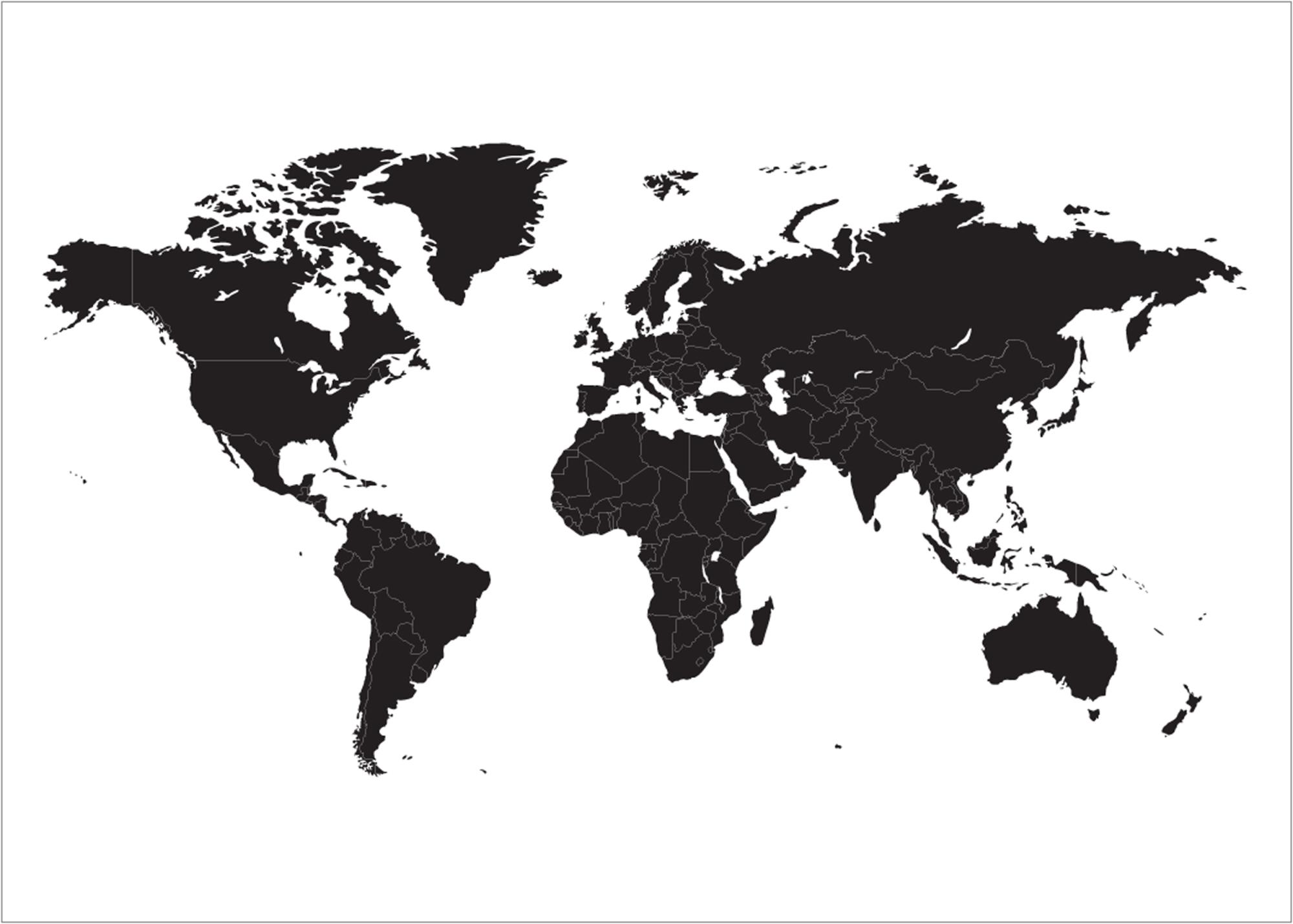 Sleek black and white world map with the continents in black where countries are marked with thin white lines. The graphic poster is equally suitable in modern minimalist environments as in interiors with classic furniture. Choose a beautiful frame that matches the rest of the interior for the painting to fit into the whole, or frame the map with a frame that really highlights the motif and makes it stand out on the wall.