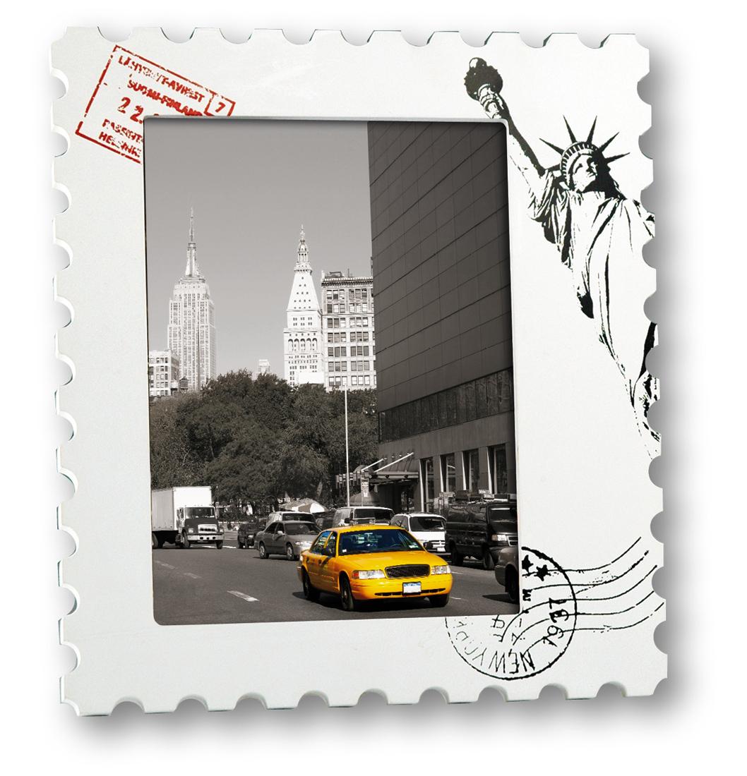 Start the frame finder »White photo frame with a shape and design inspired by a postage stamp, New York and the Statue of Liberty.