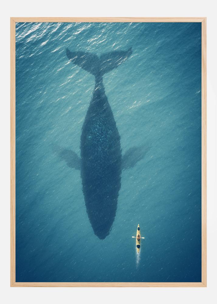 This fascinating poster captures a snapshot of a kayaker and the majestic silhouette of a whale glimpsing just below the surface of the shimmering sea. The contrast between the small vessel and the enormous whale provides a strong sense of the grand scale of nature, while the blue color palette conveys a sense of calm and the unknown depth of the sea.
