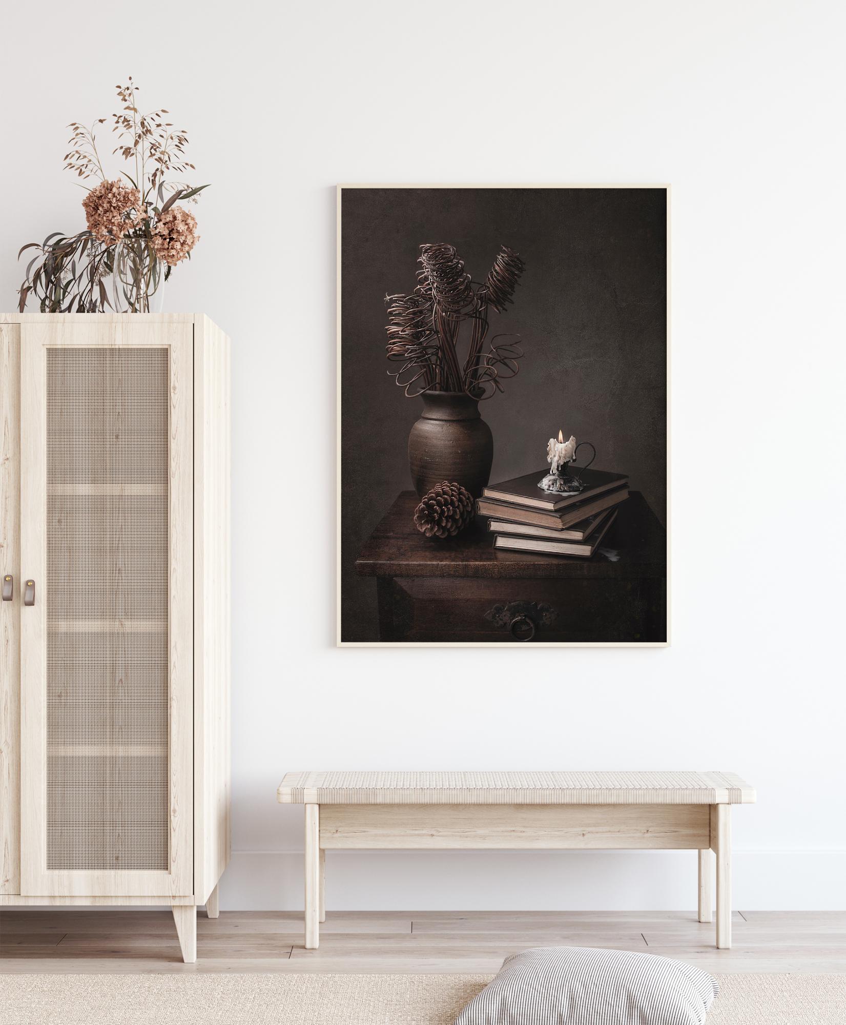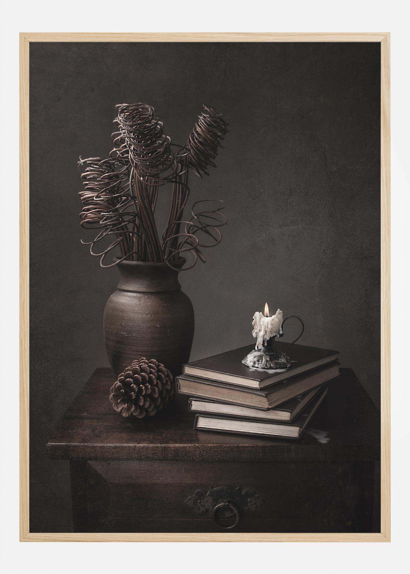 A dramatic still life poster of a jug, pinecone, books and candle on an old wooden chest of drawers. The dried curls of the plant draw the eye to the melting wax and candle flame. The dark sepia colours lend an air of mystery of a time in the past.