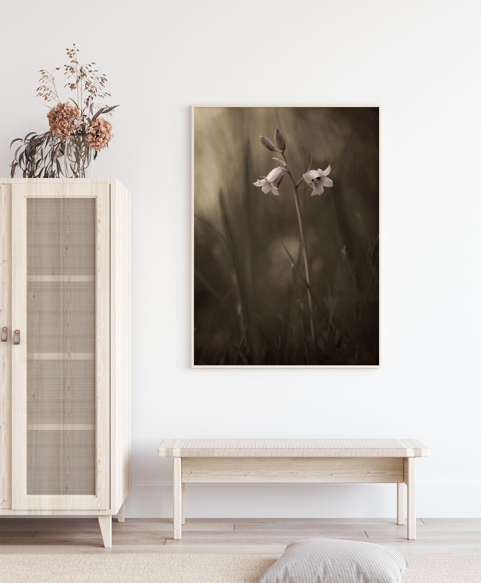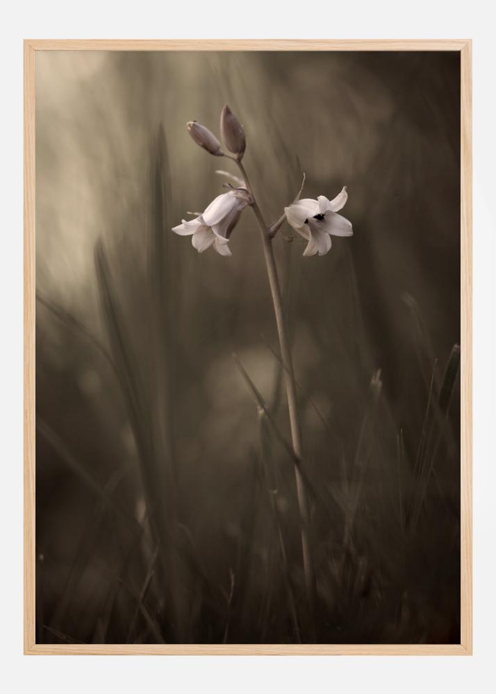 A gentle poster of a white flower set to an out-of-focus background. The white and pink bell-shaped flowers stand out in contrast to the soft grassy field behind. Pair this simple green tonal piece with a bright wall to make those flowers pop and stand out in this understated poster.