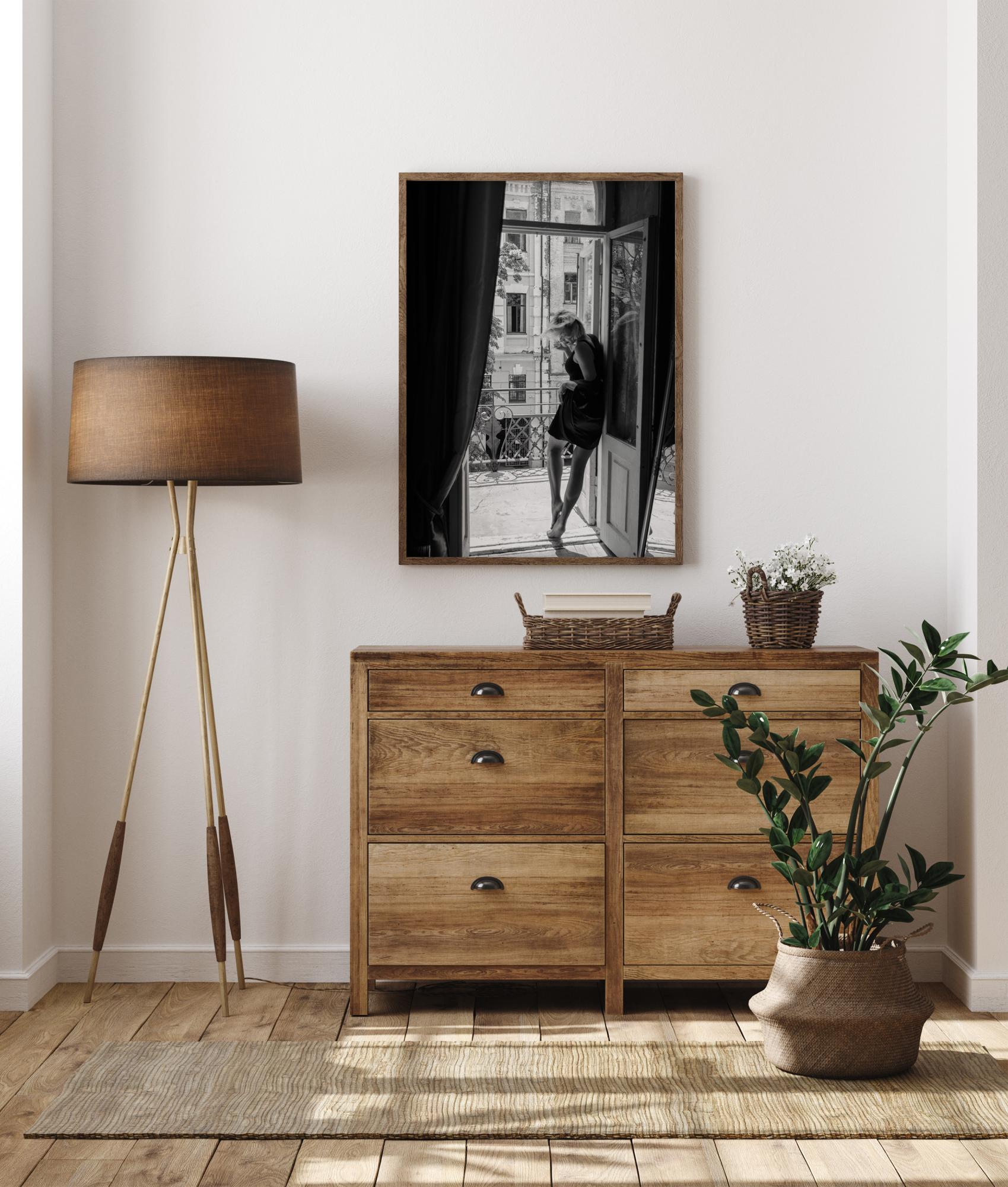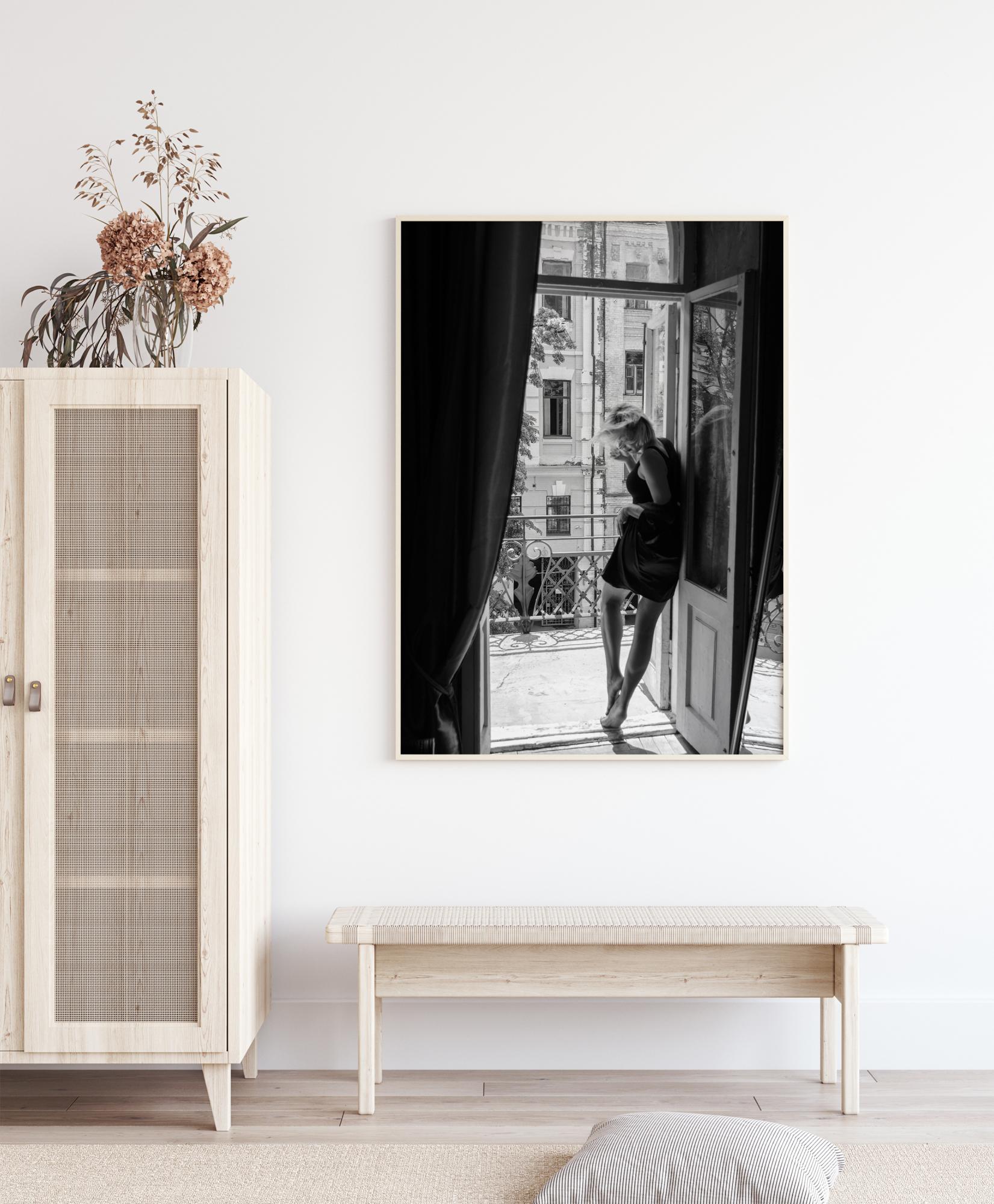 A classic poster of a woman on a balcony in Paris. The woman wears a black dress elongating her naked legs and leans on a door as she stands looking at her feet on tiptoes. Pair this black and white poster with a brightly coloured wall for a touch of elegance.
