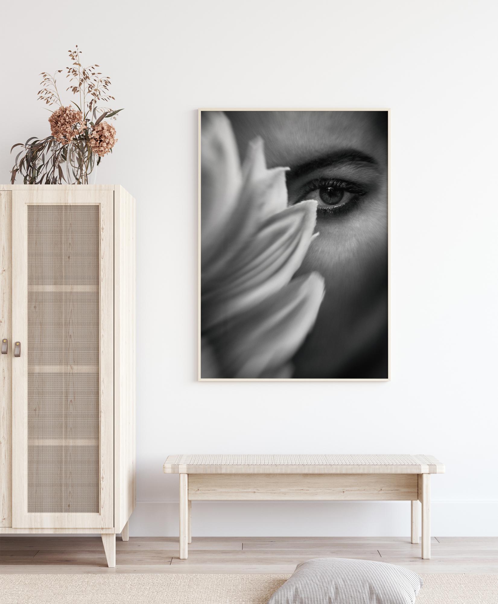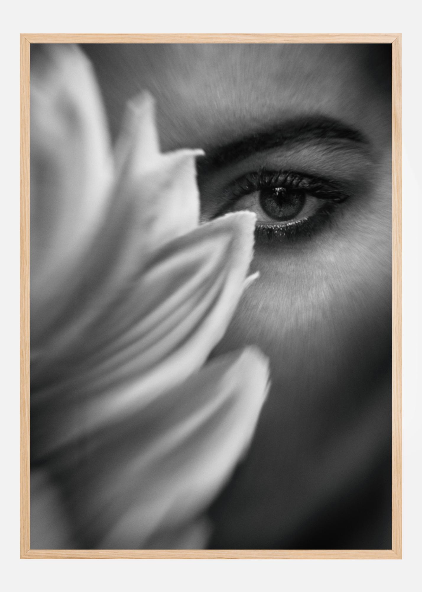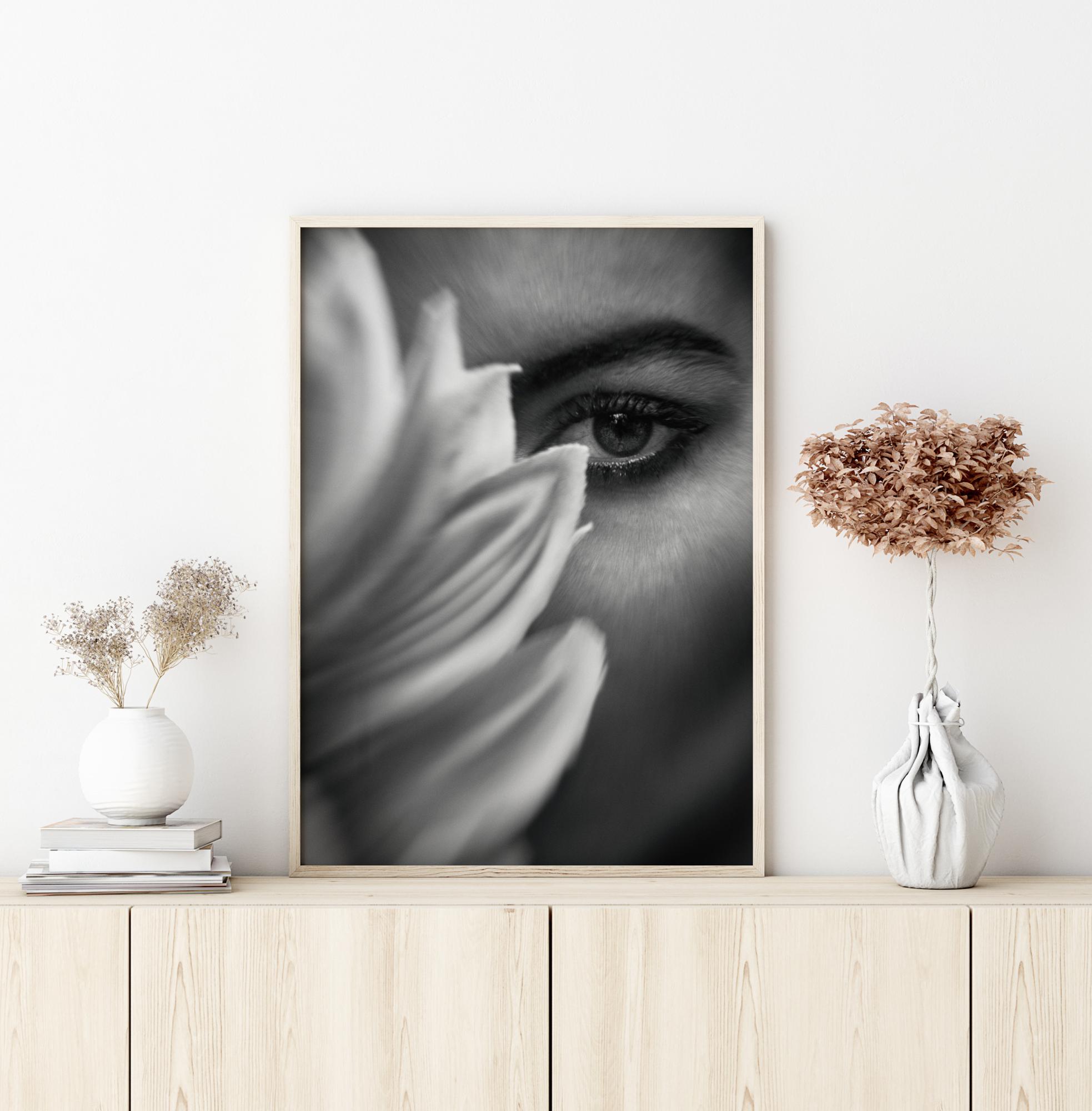 A stunning poster featuring a flower and a women's eye in close-up. The soft black and white tones make this standout against any colour. Turn any room into a soulgazing place of peace.